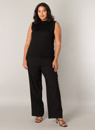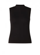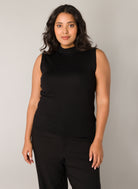 Deze zwarte damestop van Base level curvy is een essentieel kledingstuk met een fijne ribgebreide structuur. Het mouwloze T-shirt is uitgevoerd met een hooggesloten, opstaande kraag en heeft een rechte pasvorm. Dit basic item valt tot op de heup en voelt licht en comfortabel aan. Deze zwarte top is een ideale basis voor diverse combinaties.