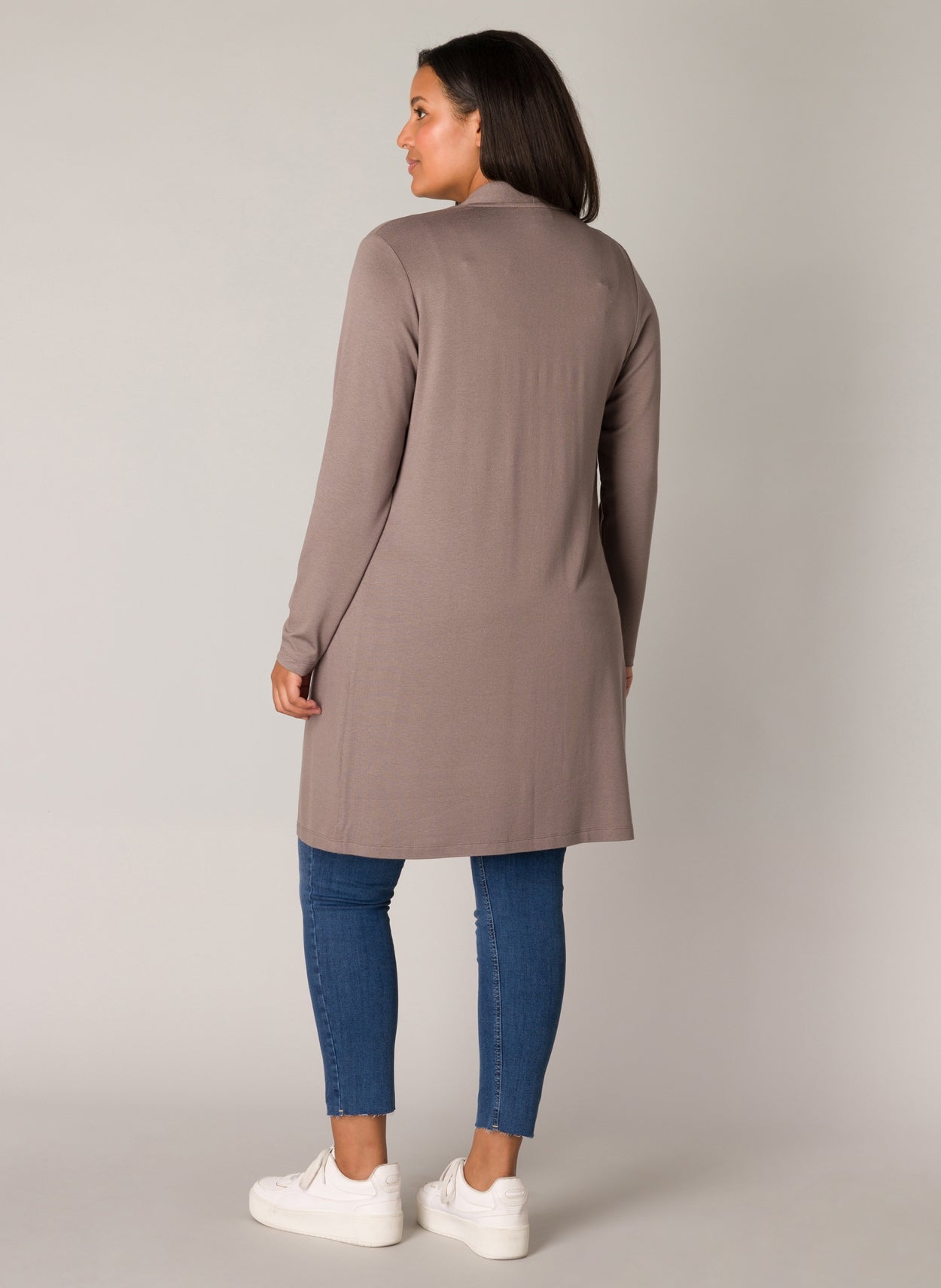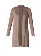 Dit lange vest van Base level curvy, type 7000001, is uitgevoerd in een egale taupe kleur. Dit gebreide kledingstuk heeft een openvallende voorkant en lange, aansluitende mouwen. De kraag is een opstaande boord die vloeiend overloopt in de voorpanden. De lange Base level curvy Vest reikt tot boven de knie, wat zorgt voor een verlengend silhouet. Je draagt dit casual kledingstuk makkelijk over je dagelijkse outfits.