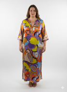 Deze multi-gekleurde maxi jurk van Just Doris heeft een rechte, ruime pasvorm. De jurk valt tot op de enkel en is voorzien van een opvallend abstract dessin in diverse felle kleuren. De hals is uitgevoerd in een V-vormige splitkraag. De lange jurk heeft een driekwart mouw en is een comfortabel kledingstuk voor een casual en optimistische look.