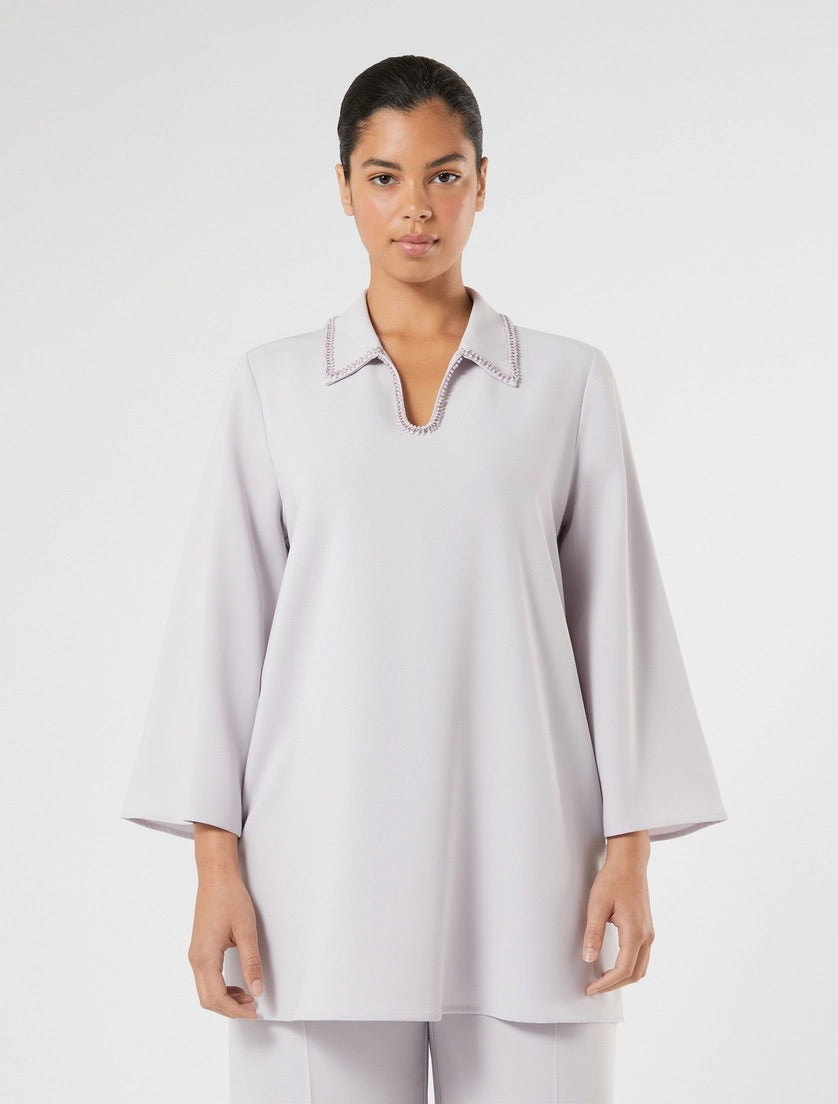 De Marina Rinaldi Blouse MRECAMPO in een zachte Lila tint is een bovenstuk met een lange, rechte pasvorm. Dit casual item is voorzien van brede driekwart mouwen. De blouse heeft een polokraag met een diepe V-uitsnede. De kraagrand en de halslijn zijn afgewerkt met subtiele, decoratieve kraaltjes in dezelfde kleur. De tuniek is ontworpen voor een ruim en comfortabel silhouet.