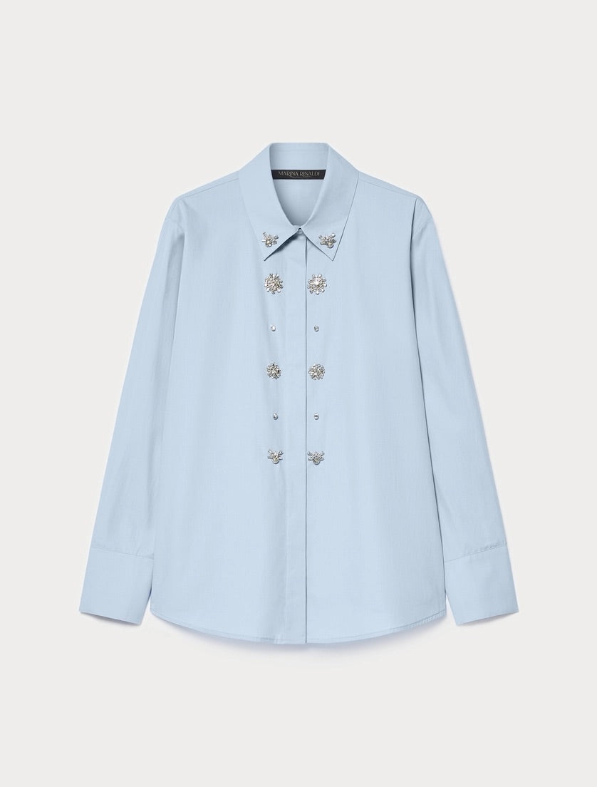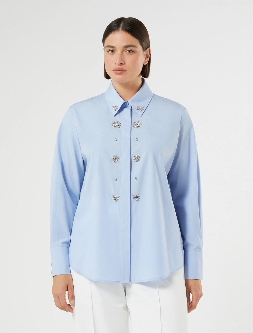 Dit lichtblauwe dames overhemd van Marina Rinaldi is uitgevoerd met een klassieke kraag. De blouse met lange mouwen heeft een doorlopende knoopsluiting. De manchetten sluiten elk met drie knoopjes. Het meest opvallende detail van deze overhemdblouse is de decoratie: op de borst en rond de kraag zijn metalen elementen geplaatst die afgewerkt zijn met kristalachtige versiering. Dit ontwerp geeft de casual look een moderne uitstraling.Pasvorm en Stijladvies