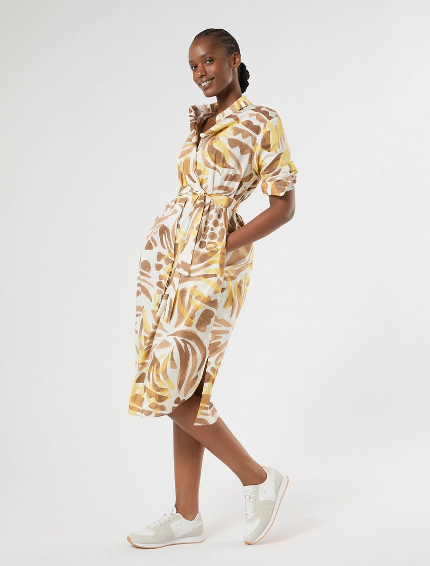 Deze Marina Rinaldi blousejurk is uitgevoerd in een casual, abstract dessin met de kleuren geel, bruin en wit. De gele damesjurk is voorzien van een klassieke kraag en een volledige knoopsluiting aan de voorzijde. Deze halflange jurk heeft korte opgerolde mouwen en is afgewerkt met praktische steekzakken aan de zijkant. Het is een toegankelijk kledingstuk voor een comfortabele en moderne levensstijl uit de collectie van Marina Rinaldi.