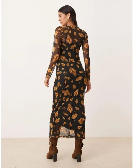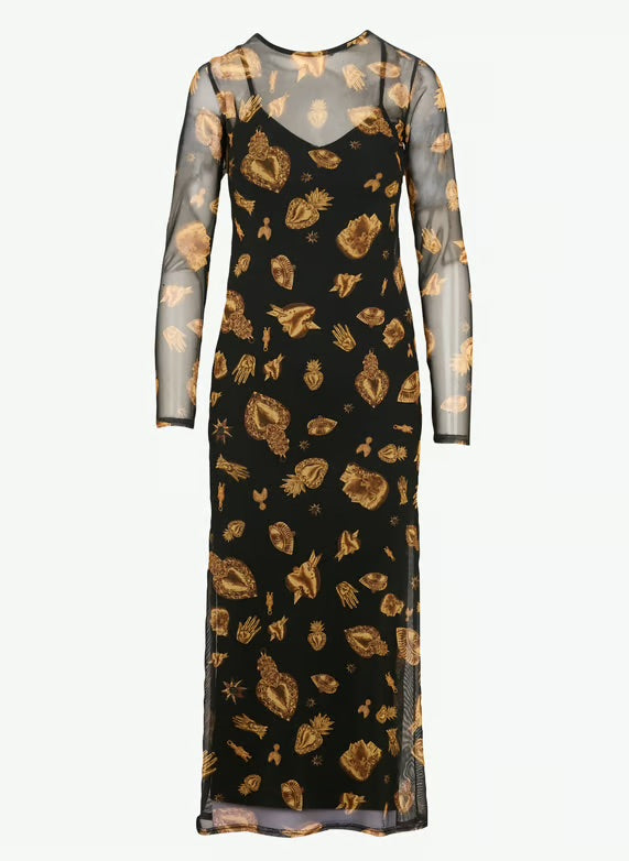 Deze lange damesjurk van Never Fully Dressed is uitgevoerd in een zwarte mesh stof. De jurk heeft lange mouwen en een ronde halslijn bij de buitenlaag. Je ziet een all-over dessin van goudkleurige en bruine heilige harten en talismans. Dit kledingstuk bestaat uit de transparante mesh laag en een ingebouwde onderjurk met een V-hals, wat zorgt voor de nodige bedekking. Dit is een moderne maxi jurk die je makkelijk stylet voor een casual gelegenheid.