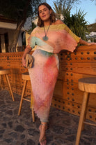 Deze Never Fully Dressed Jurk 3307 Multi is een lange dames jurk met een regenboogkleurig dessin. De geplooide jurk heeft een elastische halslijn die je asymmetrisch over één schouder of off-shoulder kunt dragen. Het kledingstuk is uitgevoerd in een plissé structuur met een all-over stippenprint. De wijde, korte mouwen en het aangesloten onderstuk zorgen voor een casual en comfortabele pasvorm. Deze maxi jurk is een opvallende toevoeging aan je garderobe.