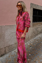 De Never Fully Dressed Rok 786 Donkerroze is een lange damesrok met een opvallend all-over paisley dessin. De rok is uitgevoerd in een fuchsia tint met motieven in rode en beige kleuren. Deze maxirok van het merk Never Fully Dressed heeft een vloeiende pasvorm en valt tot de enkels. Deze rok is een nuchtere, maar toch opvallende aanvulling op je kledingcollectie.