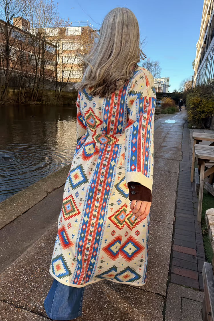 Dit lange gebreide vest van Never Fully Dressed in model 804 Multi is uitgevoerd in een opvallend geometrisch dessin. De basiskleur is crème, aangevuld met rode, blauwe en groene vlakken. Het vest is voorzien van een ceintuur in dezelfde print om de taille te accentueren. De grote reverskraag is afgewerkt met een lichte, crèmekleurige imitatiebont. Dit Never Fully Dressed vest heeft lange mouwen en een open sluiting.