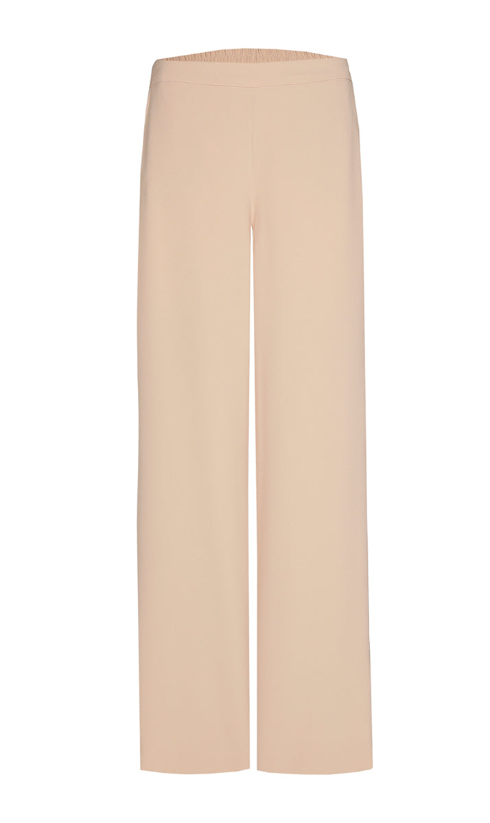 Deze Xandres pantalon in een neutrale beige tint heeft een strakke, moderne uitstraling. De broek met wijde pijpen is afgewerkt met een elastische tailleband aan de achterzijde, wat zorgt voor een comfortabele pasvorm. De voorzijde van de tailleband is glad en minimalistisch gehouden. Deze beige damesbroek is effen van dessin en heeft een lange lengte die de casual stijl van Xandres benadrukt.