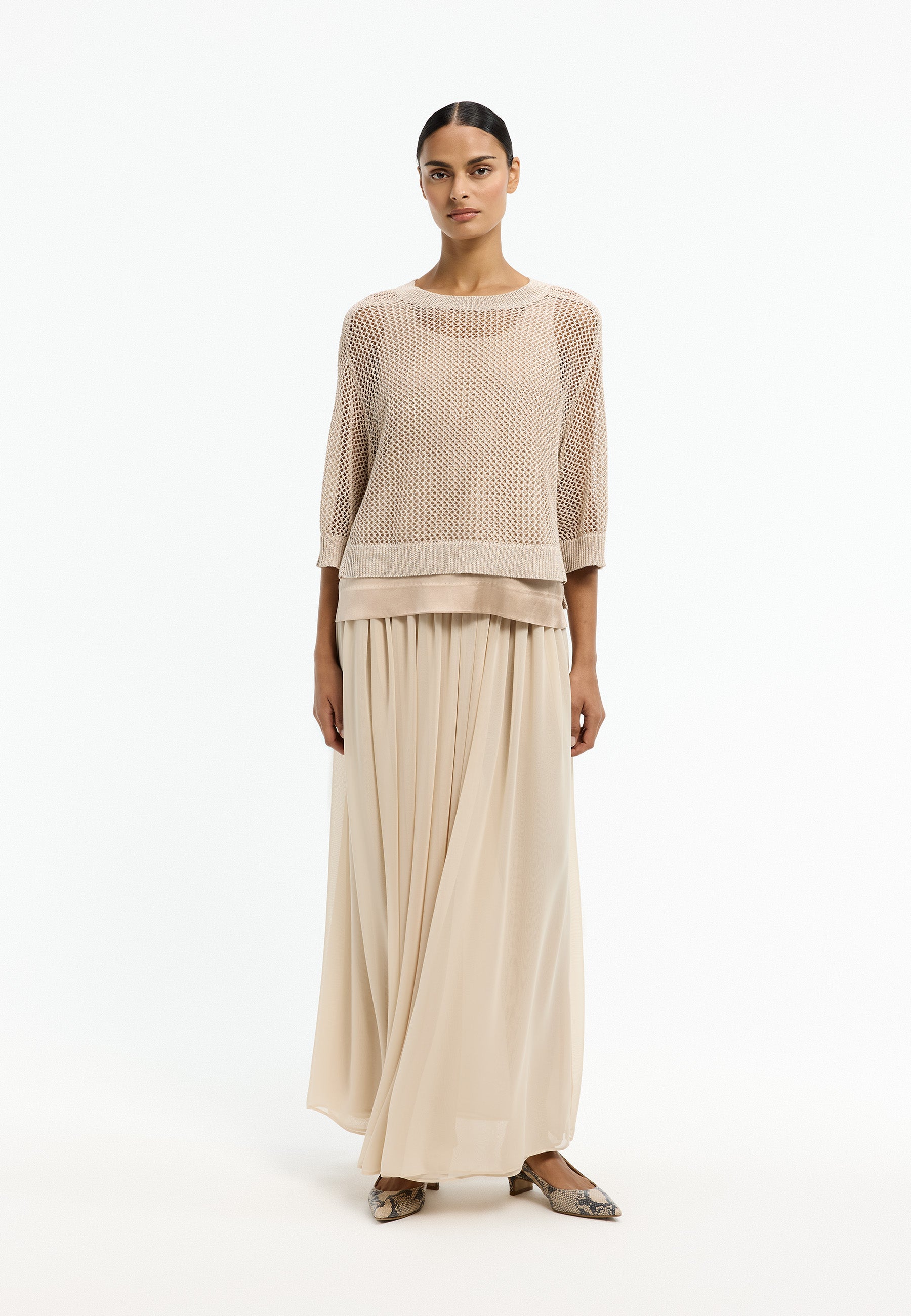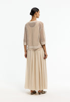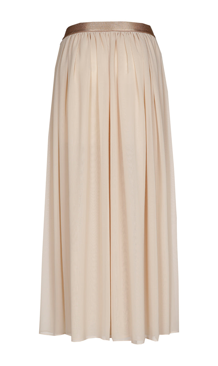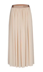 Deze lange rok van Xandres is uitgevoerd in een lichte, zandkleurige stof die soepel valt. Het model kenmerkt zich door fijne verticale plooien over de gehele lengte. De maxi rok heeft een elastische tailleband met een glanzende, bruinige finish. De buitenste laag is licht doorschijnend en is voorzien van een ondoorzichtige voering voor een gelaagd effect.