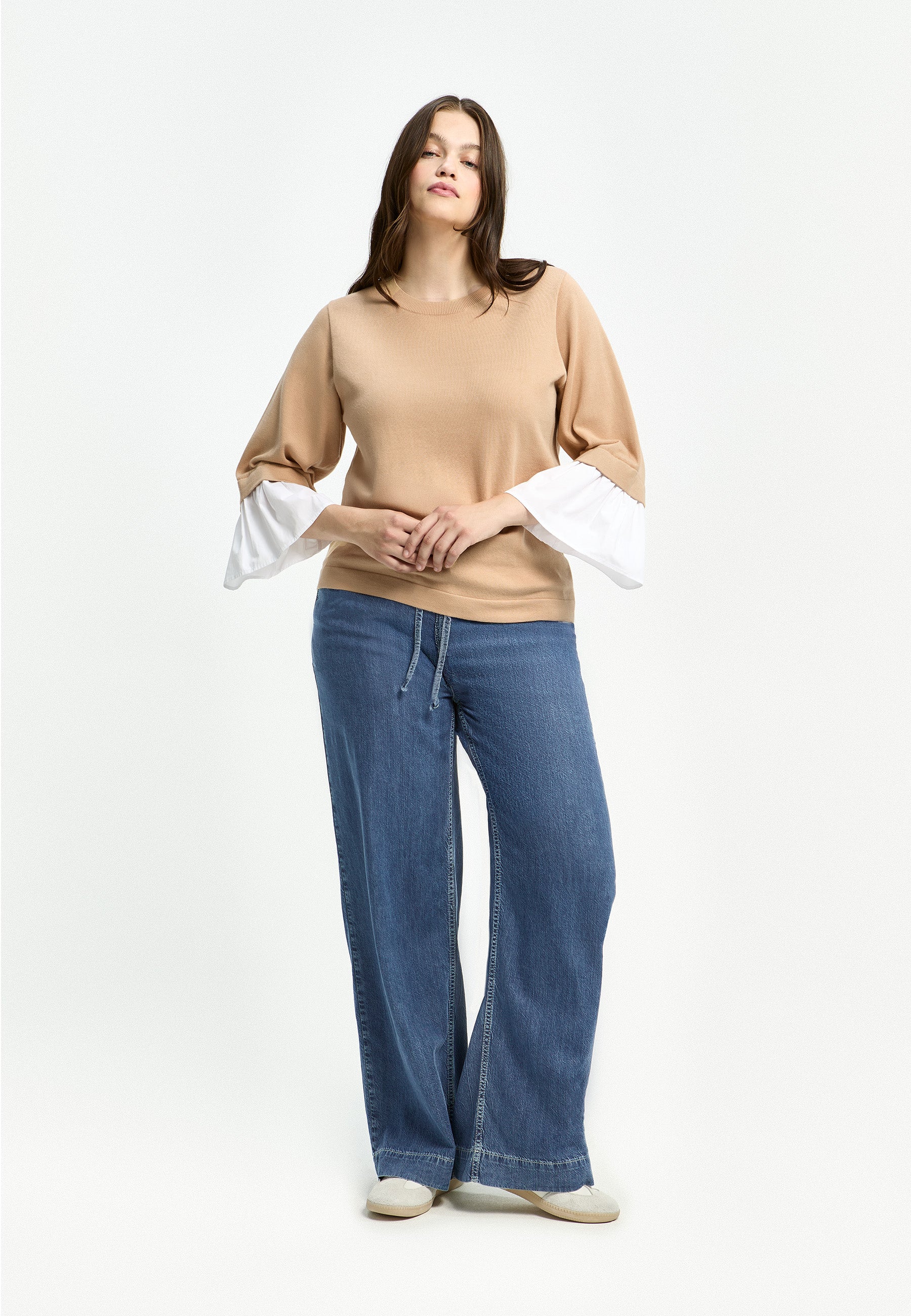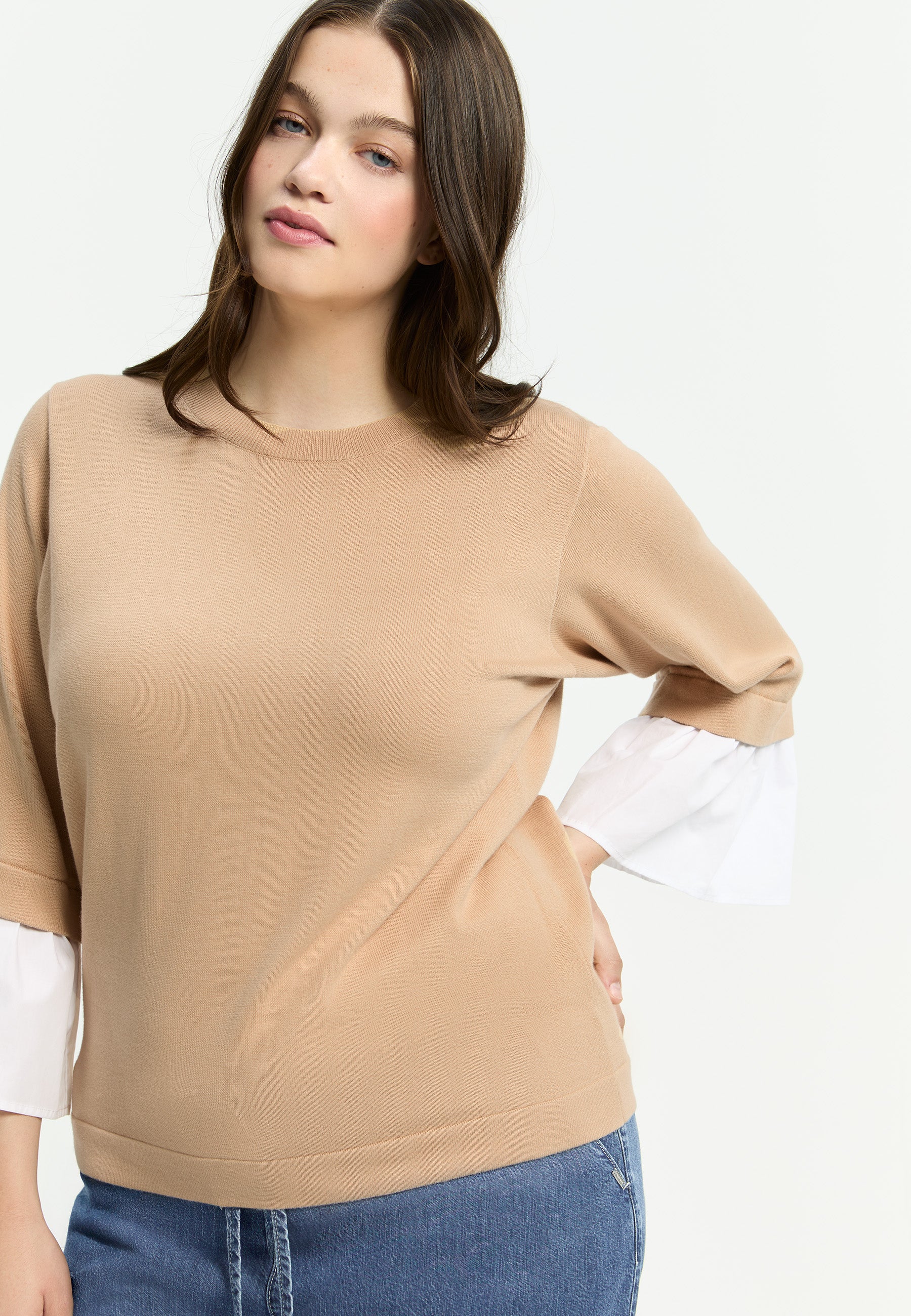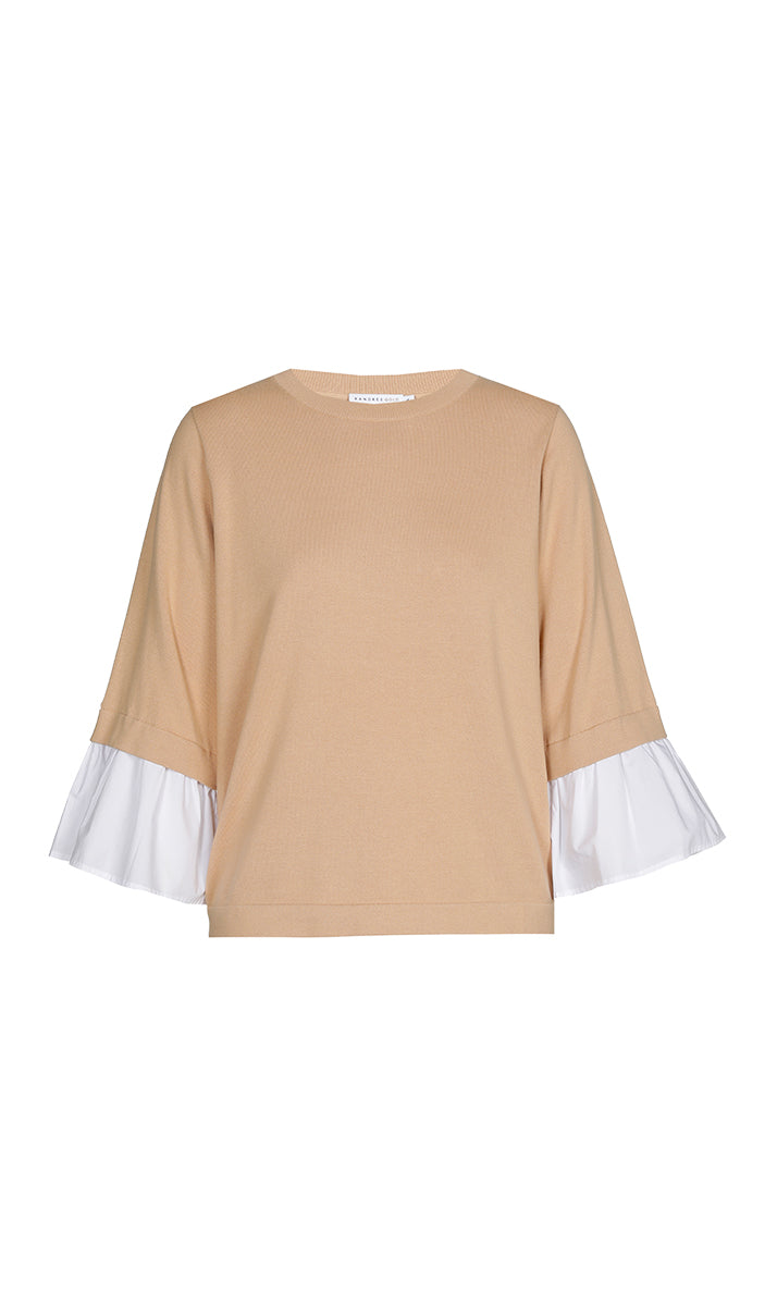 Deze gebreide pullover van Xandres is uitgevoerd in een rustige beige tint. De trui heeft een klassieke ronde hals en is voorzien van driekwart mouwen. Kenmerkend voor deze Xandres trui (29517-01) zijn de wijde volants in contrasterend wit katoen aan de onderzijde van de mouwen. De effen gebreide stof is gecombineerd met de geplooide, geweven manchetten, wat zorgt voor een moderne uitstraling van dit breisel.