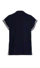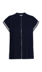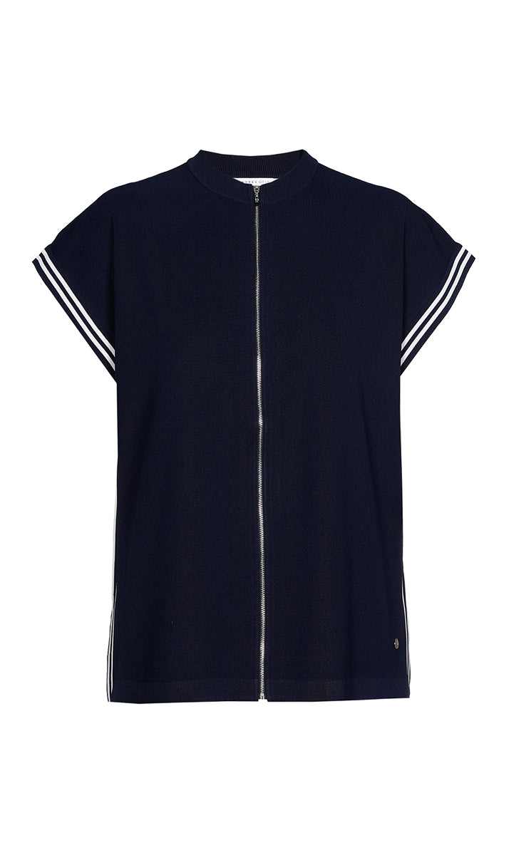 Dit donkerblauwe vest van Xandres is uitgevoerd in een fijn gebreide stof met een subtiele textuur. Het korte mouwloze jack heeft een staande ronde kraag en wordt gesloten met een zilverkleurige ritssluiting over de gehele lengte. Kenmerkend voor dit gebreide vest zijn de witte dubbele strepen die zichtbaar zijn op de capmouwen en langs de zijkanten. Dit maakt het Xandres Vest 29501-01 Donkerblauw een comfortabele en casual keuze.