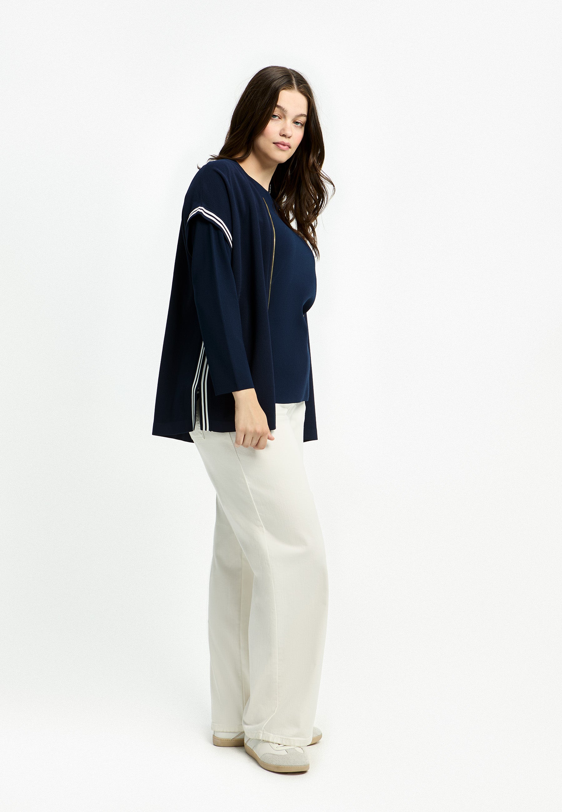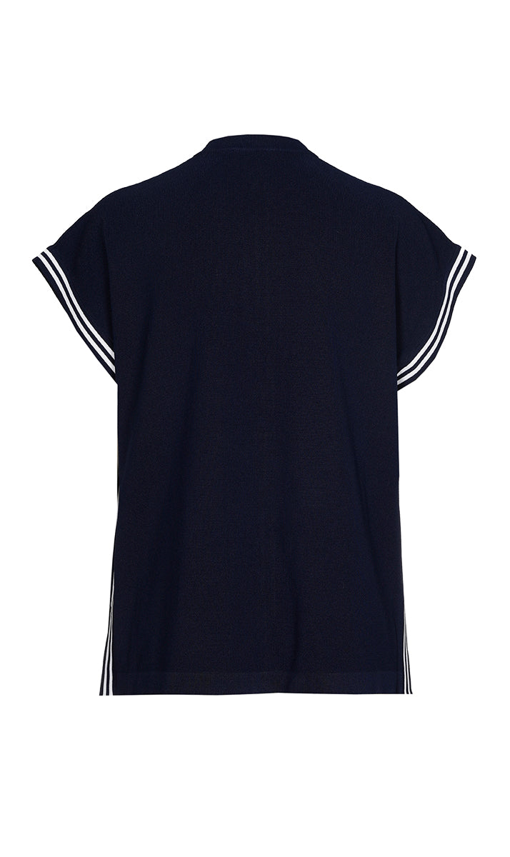 Dit korte gebreide jack is ideaal voor een relaxte en toegankelijke dagelijkse look. Je combineert dit sportieve vest makkelijk met een lichte broek om de contrasterende streepdetails te accentueren. Voor een complete casual outfit kun je er een effen donkerblauwe top onder dragen.Productkenmerken