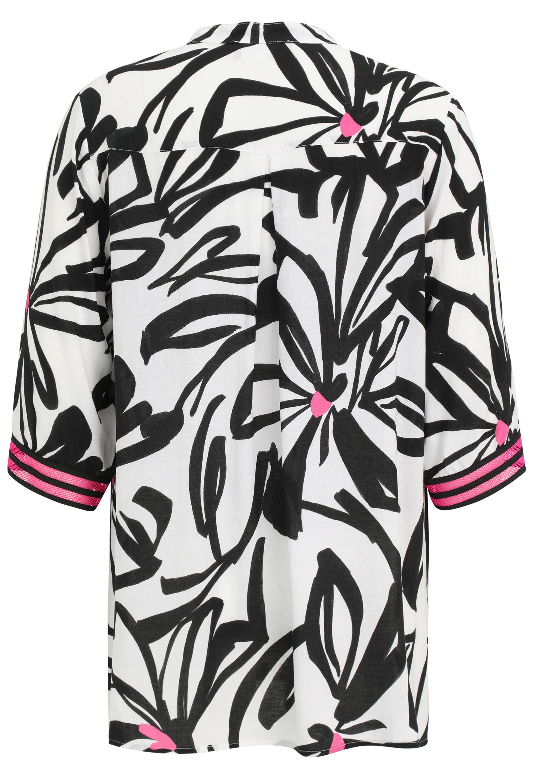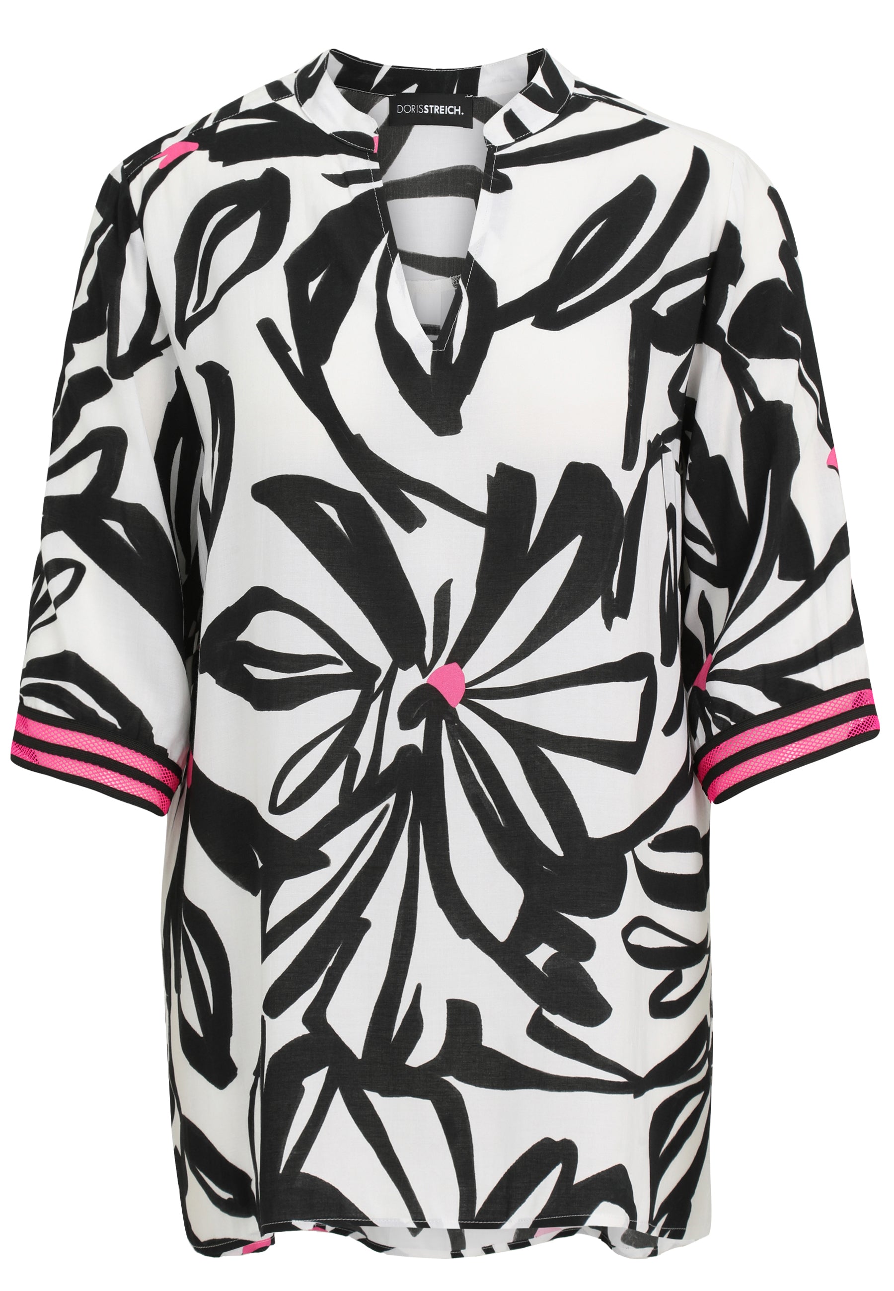 Deze Doris Streich blouse 218 307 is een casual dames bovenstuk uitgevoerd in een zwart-wit all-over dessin. Het ontwerp heeft een opstaande kraag en een V-vormige halsopening. De mouwen vallen tot de elleboog en zijn afgewerkt met een dubbele gestreepte bies in roze en zwart. Dit abstracte florale patroon kenmerkt de tuniek van Doris Streich, wat zorgt voor een open en nuchtere uitstraling voor je dagelijkse kleding.Pasvorm en Stijladvies
