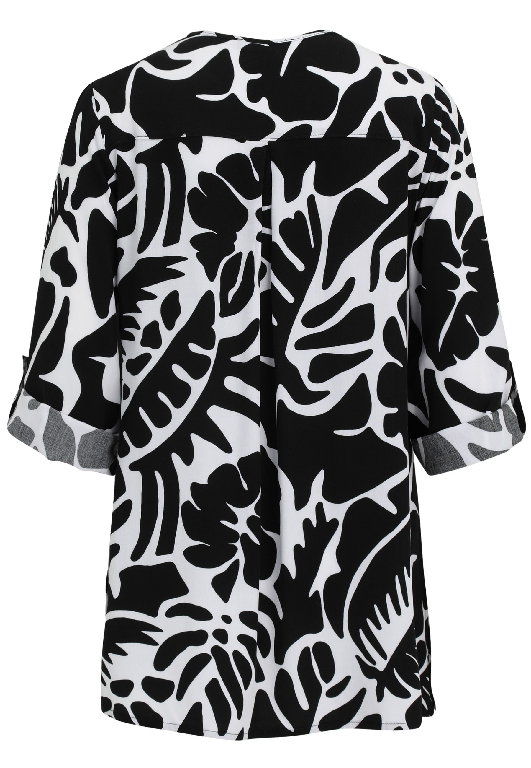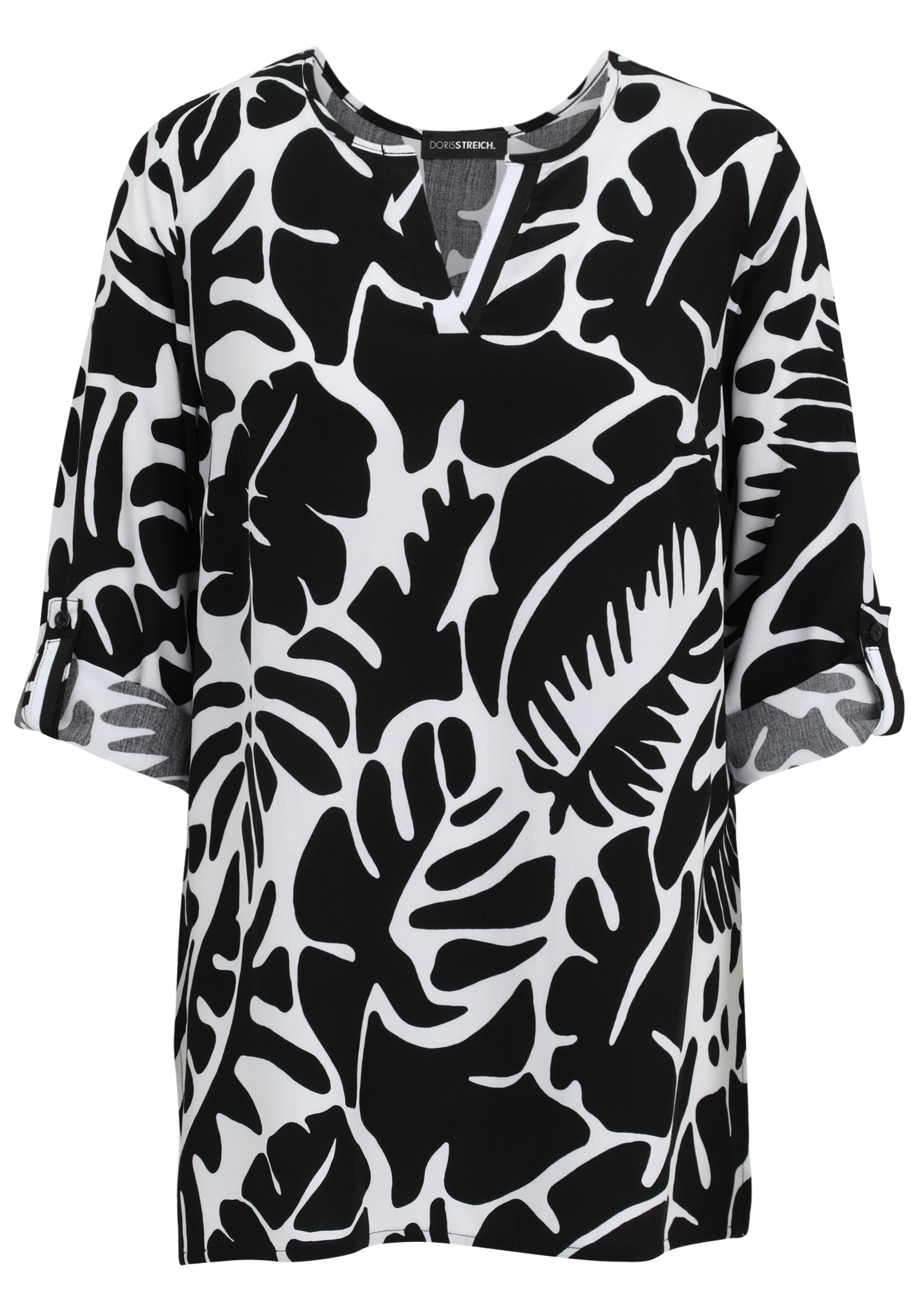 De Doris Streich Blouse 235 138 Zwart/Wit is een dames bovenstuk met een abstract bladvormig dessin. Deze soepele blouse is uitgevoerd in een zwart-wit kleurenschema en beschikt over een korte V-hals. De halflange mouwen van dit shirt van Doris Streich zijn voorzien van een knoop en lus, waardoor je de mouwen makkelijk oprolt voor een casual uitstraling. Dit model is ontworpen voor een ruime pasvorm, wat zorgt voor optimaal draagcomfort.