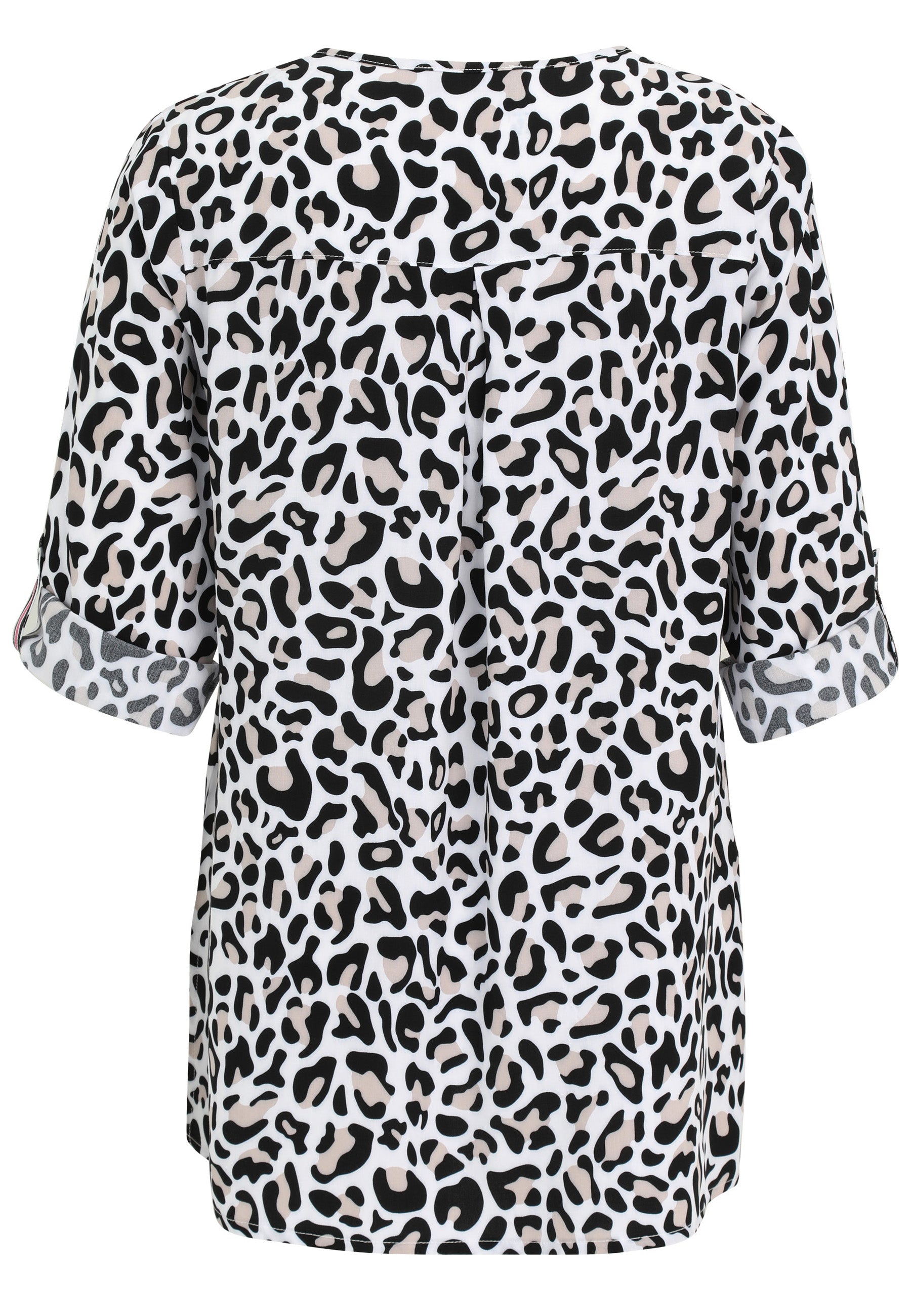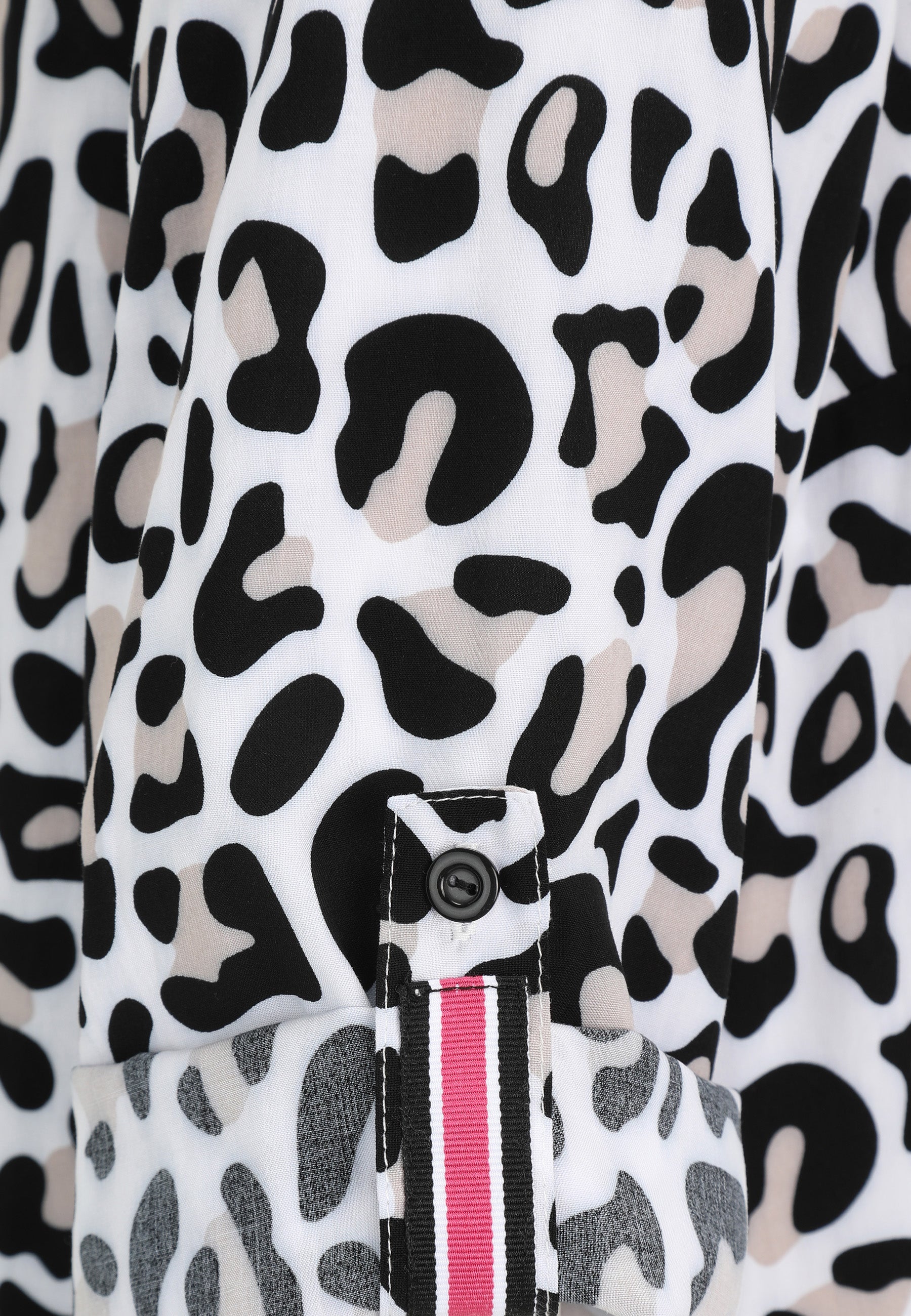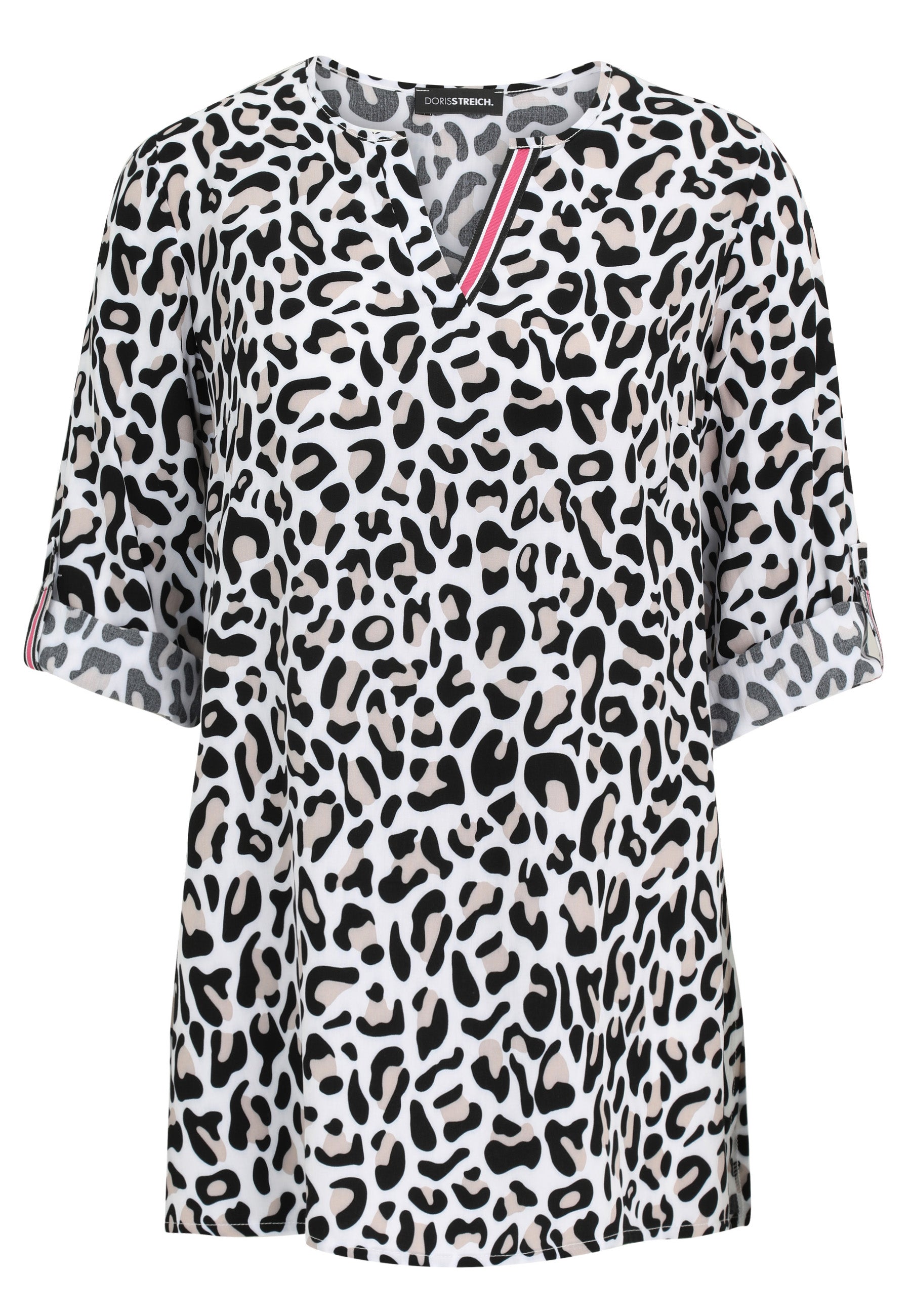 Deze Doris Streich Blouse 235 141 Donkergrijs is uitgevoerd met een all-over luipaardprint in wit, zwart en beige tinten. Je ziet dat deze casual damesblouse een V-hals heeft met een korte strook in de hals, afgewerkt met een roze/witte streep. De korte mouwen hebben een vaste omslag die je vastzet met een knoopsluiting en een bandje met dezelfde roze streep. Dit casual overhemd is een makkelijke basis voor je dagelijkse look.