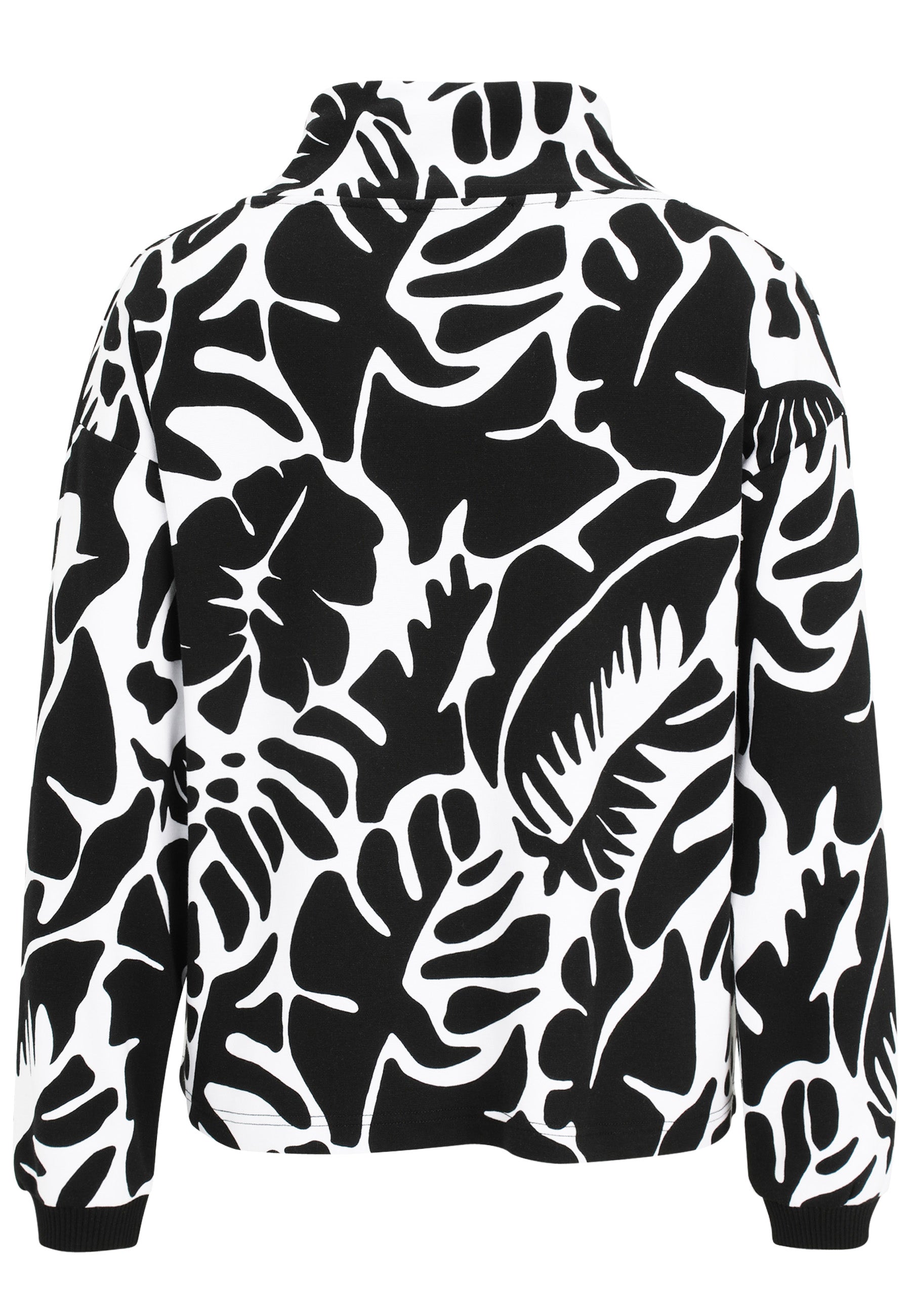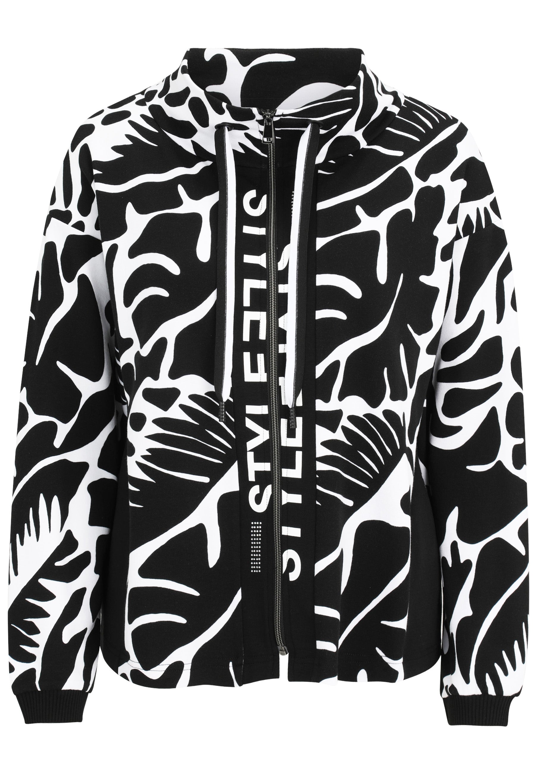 Deze Doris Streich jas is een kort sweatvest met een all-over monochrome bladerprint. Dit jack is uitgevoerd in een opvallend Zwart/Wit dessin en sluit met een rits aan de voorzijde. De rits wordt geflankeerd door verticale banden met het woord 'STYLE' en subtiele strass-details. De opstaande kraag geeft je een sportieve uitstraling. Deze Doris Streich jas is een casual toevoeging aan je garderobe.