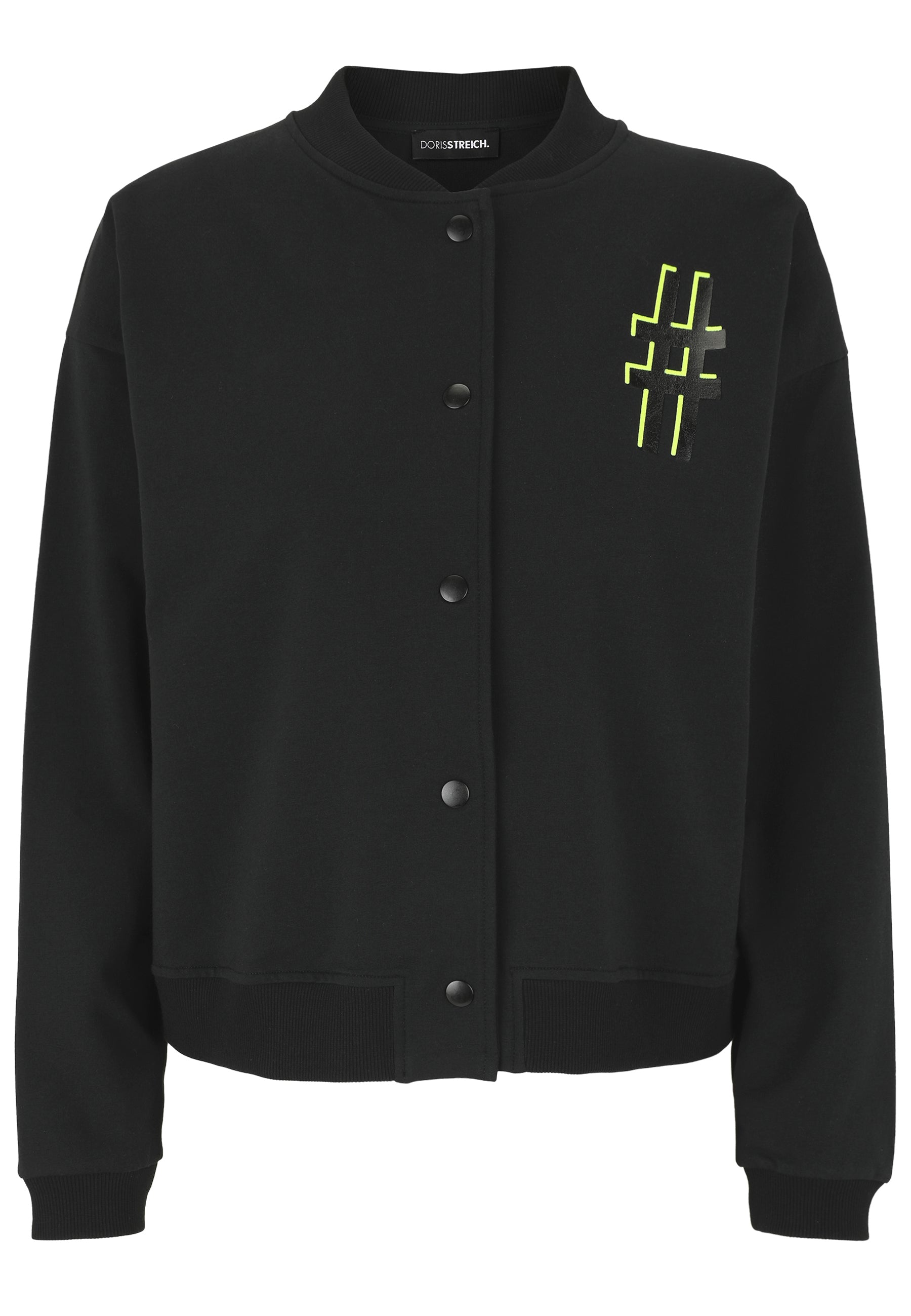 Dit casual zwarte Doris Streich jack, model 111 142, is uitgevoerd in een klassieke bomberjack stijl. De jas heeft een ronde halslijn en sluit volledig met een rij zwarte drukknopen aan de voorzijde. Op de borst is een grafische neongele print aangebracht. Zowel de manchetten als de zoom zijn afgewerkt met een ribboord. Deze korte jas biedt je een relaxte en moderne look die ideaal is voor dagelijks gebruik.