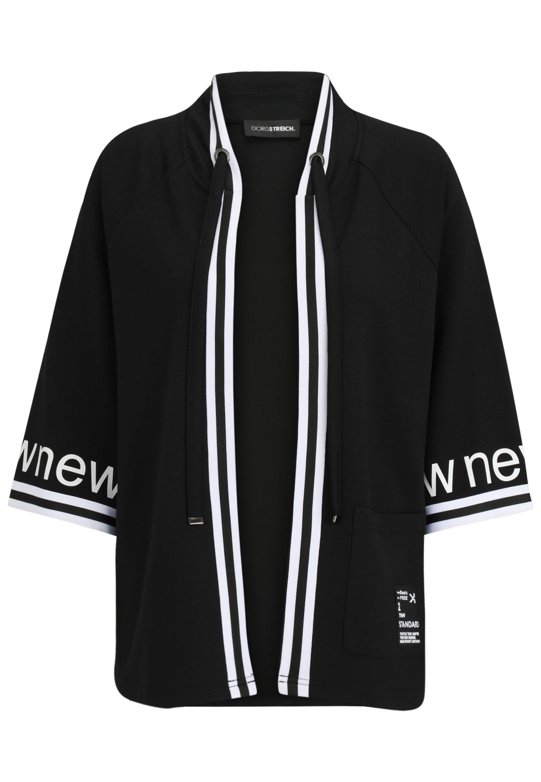 Zoek je een casual jasje? Dit Doris Streich jack, de Doris Streich Jas 124 115 Zwart/Wit, is een open model dat soepel valt. Het sportieve vest heeft raglanmouwen met een driekwart lengte en brede, gestreepte boorden, inclusief de opdruk 'new'. Je vindt een steekzak aan de voorzijde en decoratieve trekkoorden bij de hals. Dit zwarte jack met witte details is perfect voor elke dag.Pasvorm en Stijladvies