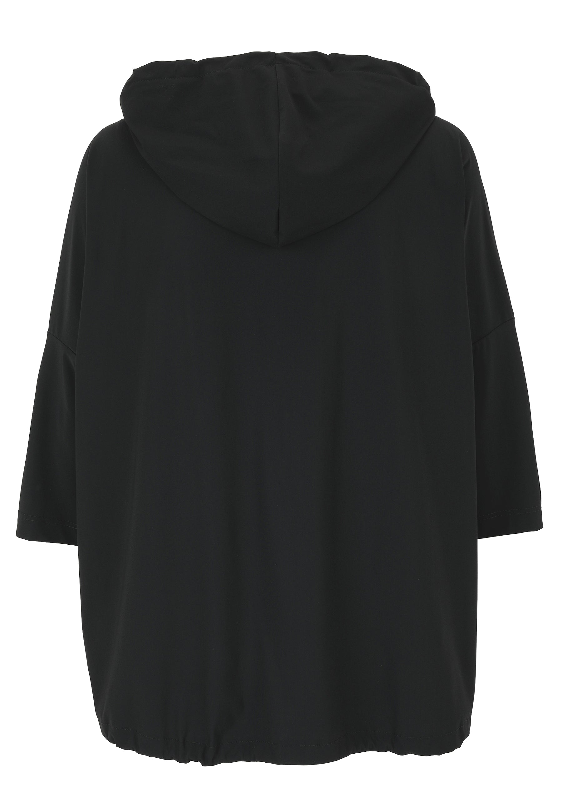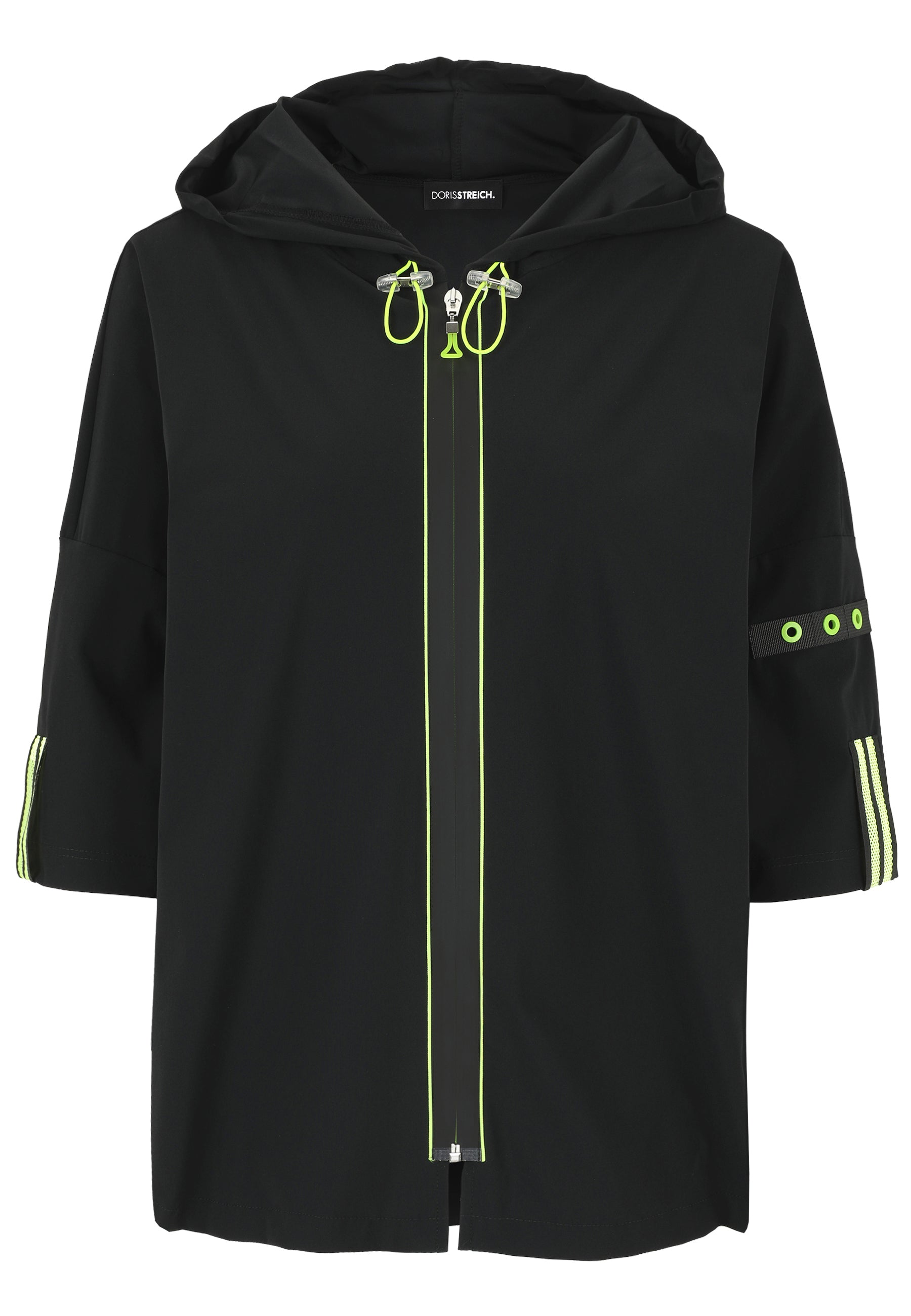 Deze Doris Streich jas 139 600 Zwart is een lichte tussenjas met een vaste capuchon. De jas sluit met een zilverkleurige ritssluiting over de gehele lengte. Opvallend is de neongele bies langs de rits en de neonkleurige trekkoorden. De driekwartmouwen zijn afgewerkt met neongele strepen op de manchet en aan de zijkant zijn drie decoratieve ringen aangebracht. De zoom is voorzien van een elastisch koord aan de binnenzijde.Pasvorm en Stijladvies