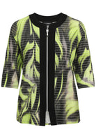 Dit korte dames jack van Doris Streich heeft een all-over dessin met een combinatie van limegroen, zwart en grijstinten, onderbroken door dunne horizontale lijnen. Het vest sluit middenvoor met een zilverkleurige ritssluiting, geplaatst op een zwarte, verticale band. De ronde halslijn is eveneens uitgevoerd in een effen zwarte ribboord. Dit jack met 3/4 mouwen biedt jou een moderne overlay met een duidelijke focus op kleur.