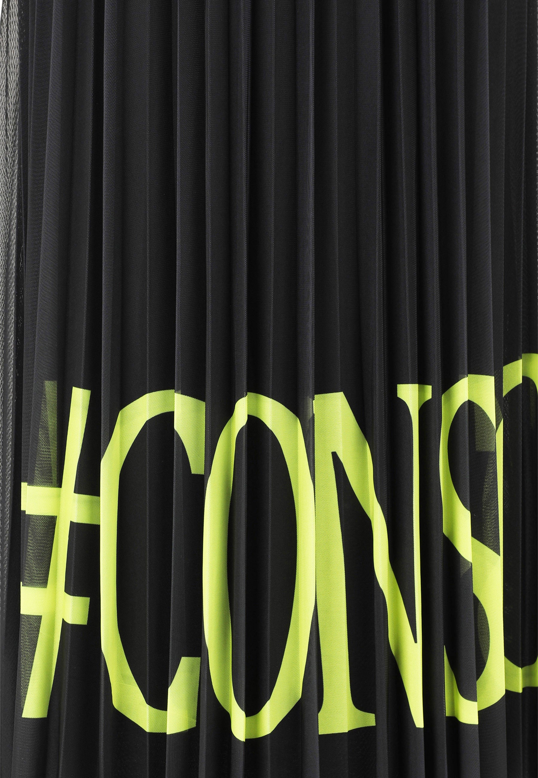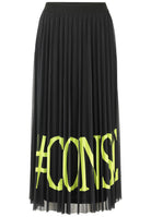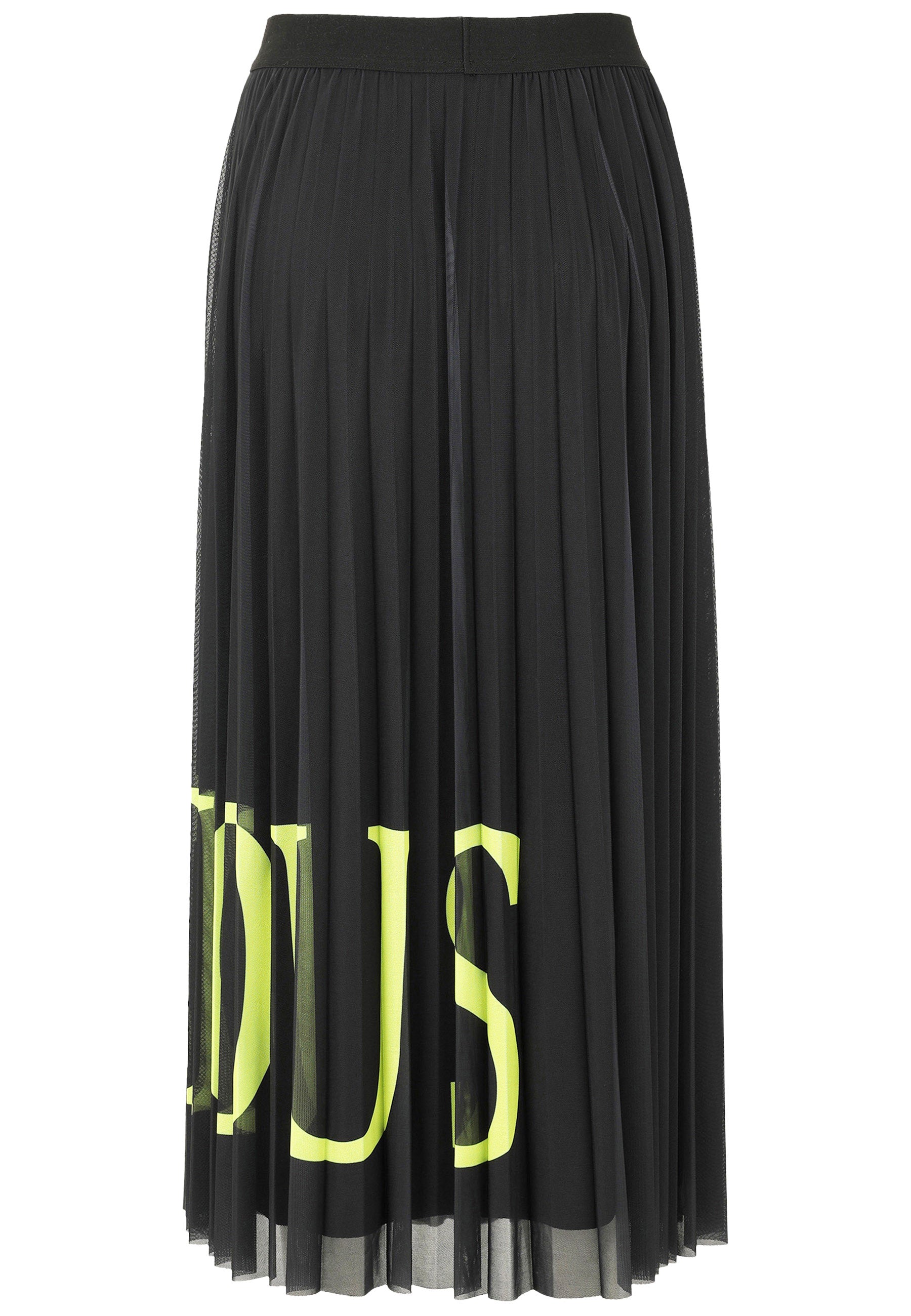 De Doris Streich geplooide rok 945 136 in het zwart is een opvallende damesrok. Deze lange rok is gemaakt van zwarte tule en valt tot over de knie. Het plissédessin wordt aan de onderzijde geaccentueerd door een heldere, neongele print met de tekst ‘#CONS!’. De rok is voorzien van een comfortabele, elastische tailleband.