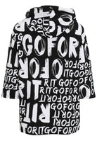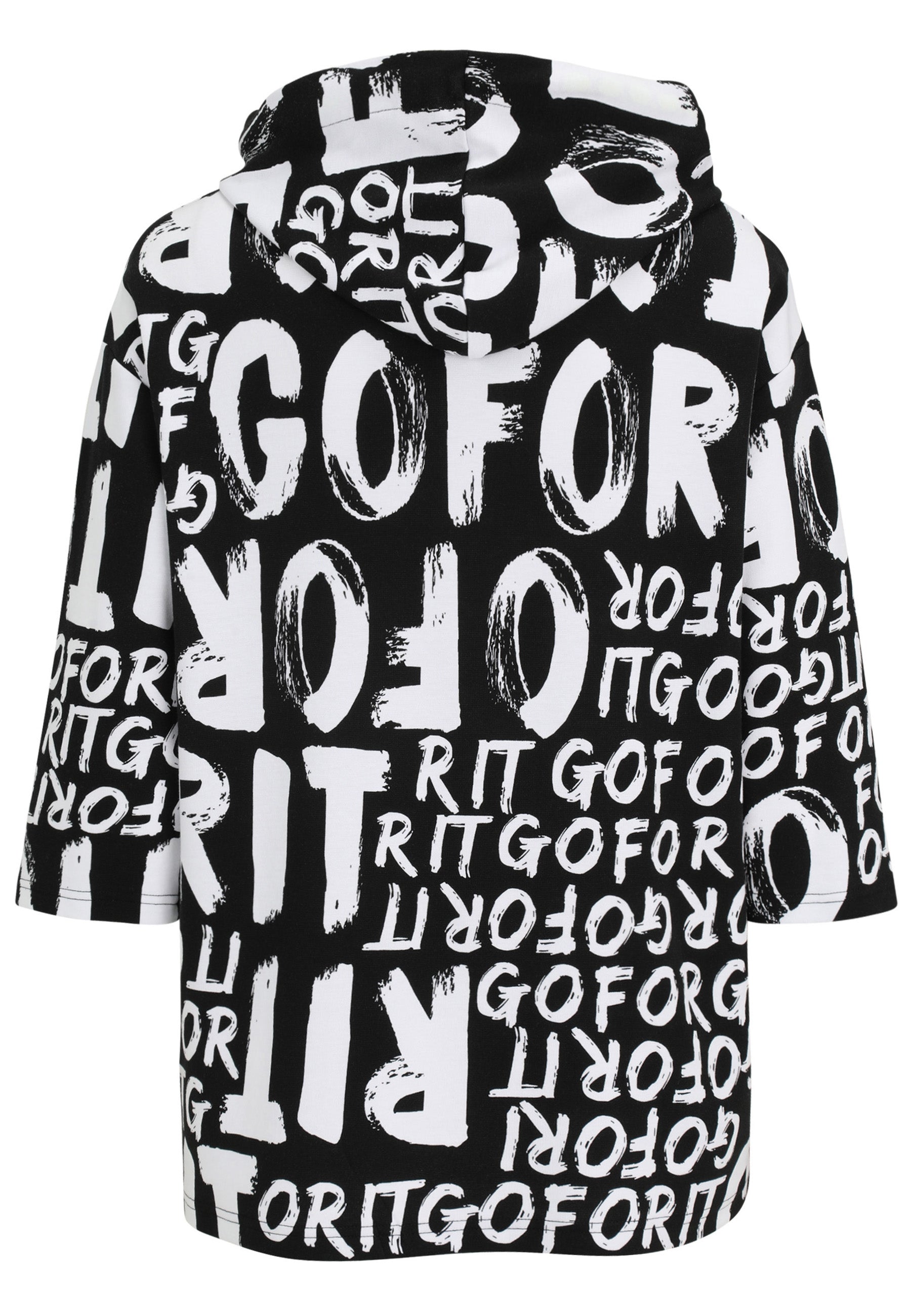 Dit moderne shirt met capuchon van Doris Streich, officieel de Doris Streich T-Shirt 357 121 Zwart/Wit, heeft een all-over zwart-wit print. Je ziet opvallende, grote letters, waaronder de tekst ‘GO FOR IT’. Dit T-shirt heeft driekwart mouwen en een vaste capuchon. Het casual model biedt comfort voor dagelijks gebruik.Pasvorm en Stijladvies