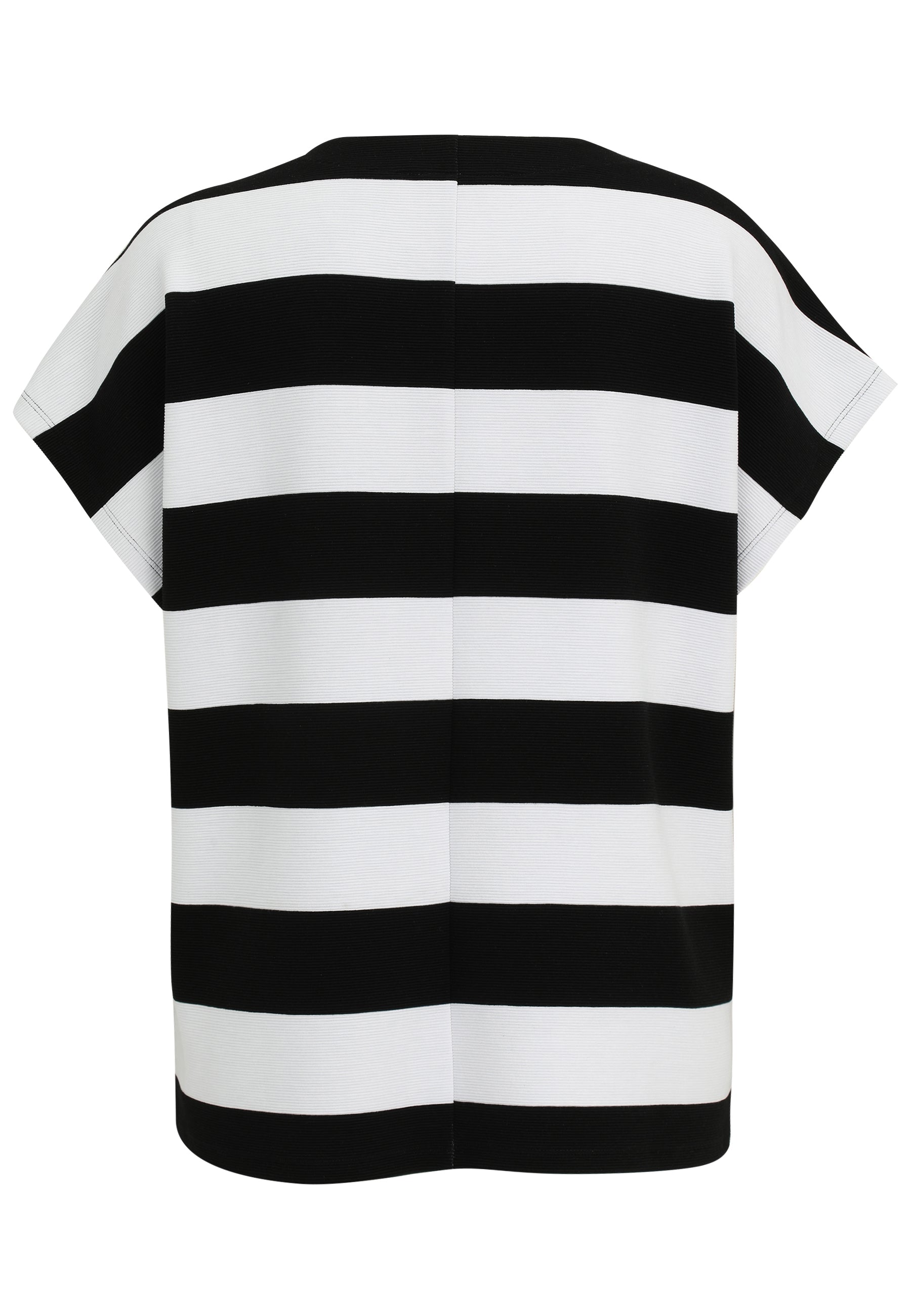 Dit moderne Doris Streich T-shirt in zwart-wit streepdessin is een casual dames top. Het shirt heeft een ronde hals en korte, wijdvallende mouwen. Centraal op de borst is een grote, feloranje print met de letters ‘FIS’ geplaatst, wat zorgt voor een opvallend en optimistisch contrast. Dit gestreepte shirt is door de losvallende snit een toegankelijk kledingstuk dat je makkelijk combineert voor een nuchtere, alledaagse look.