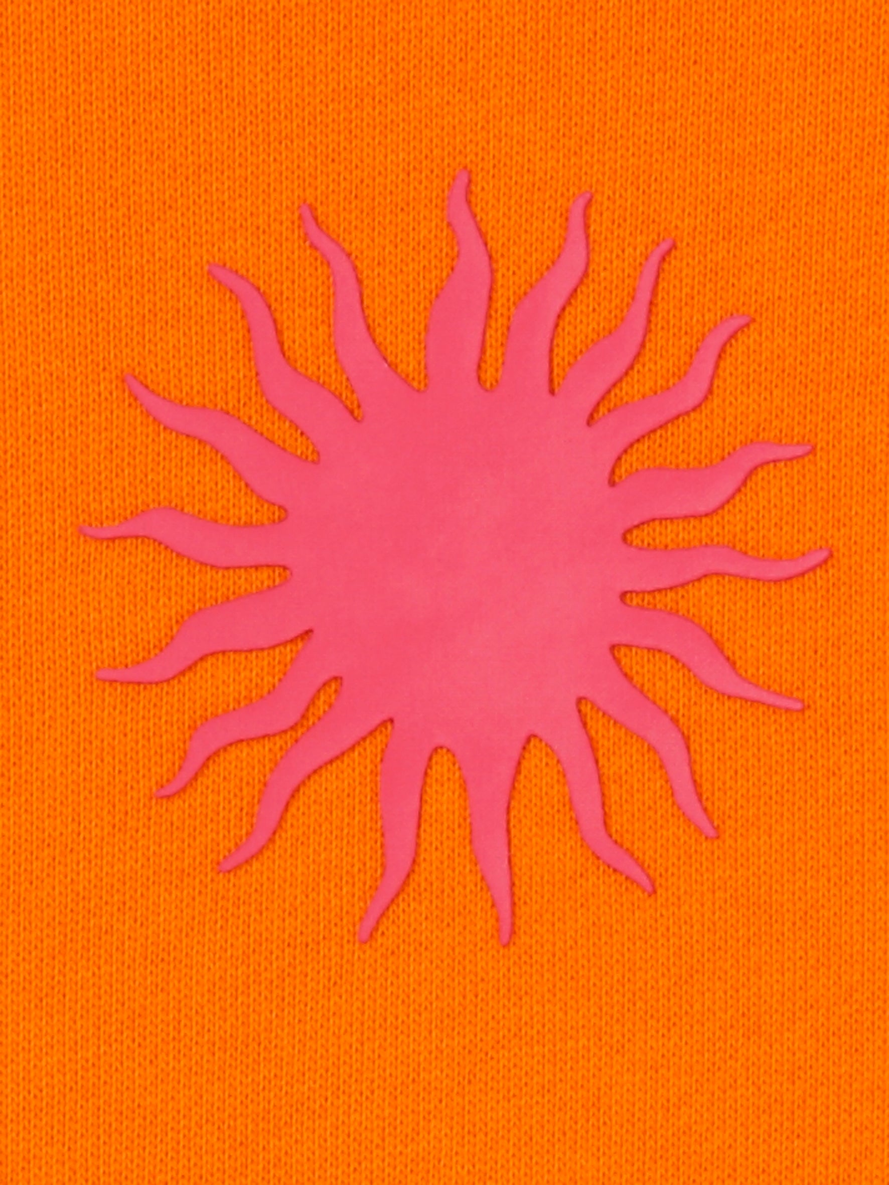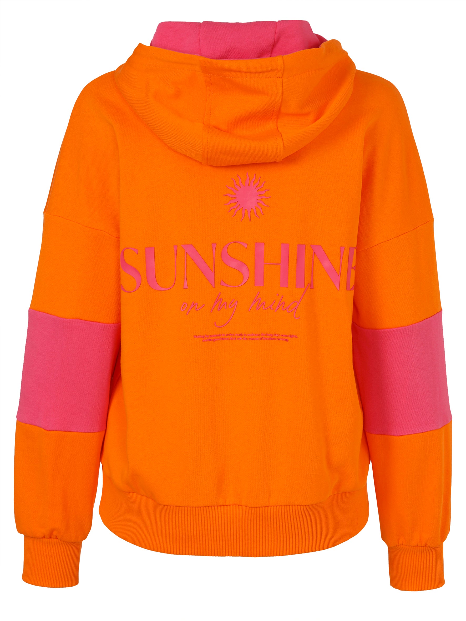 Dit neon oranje sweatvest van Eiszeit is voorzien van een comfortabele capuchon en lange mouwen. Het capuchonvest sluit met een doorlopende rits in de kleur fuchsia. De contrastkleur fuchsia zie je terug in de zijpanden op de mouwen en de voering van de capuchon. Op de achterzijde van dit sportieve jack staat een opdruk met een zongrafiek en de tekst ‘SUNSHINE’ in het roze. Dit kledingstuk is afgewerkt met ribgebreide boorden.Pasvorm en Stijladvies
