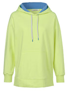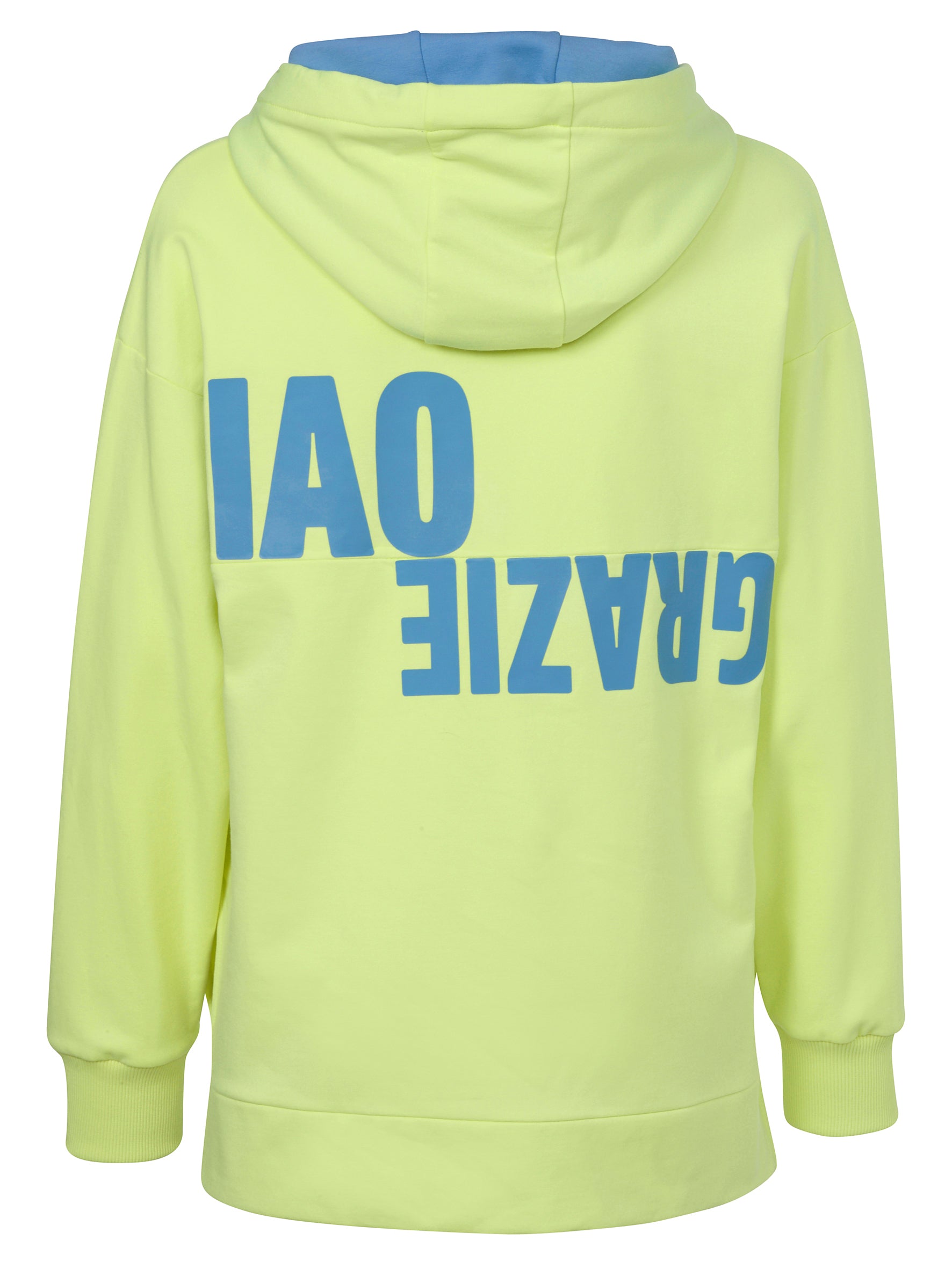 Deze Eiszeit capuchontrui is uitgevoerd in een opvallende geelgroene lime tint. Het casual model heeft lange mouwen en is gemaakt van zachte sweatstof. De vaste capuchon is voorzien van een contrasterende sky blue voering aan de binnenzijde en een trekkoord. De hoodie is afgewerkt met ribboorden aan de mouwen en onderkant. Aan de voorzijde bevindt zich een opgestikte kangoeroezak. Op de rug is een grote blauwe tekstopdruk te zien met de woorden 'IAO' en 'GRAZIE'.Pasvorm en Stijladvies