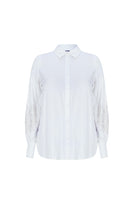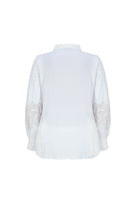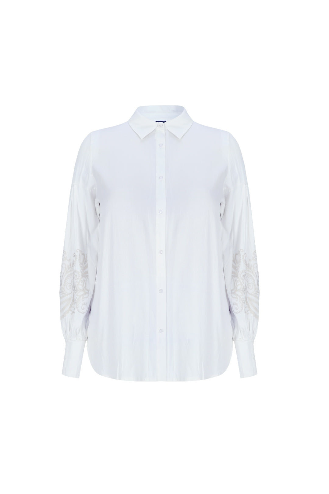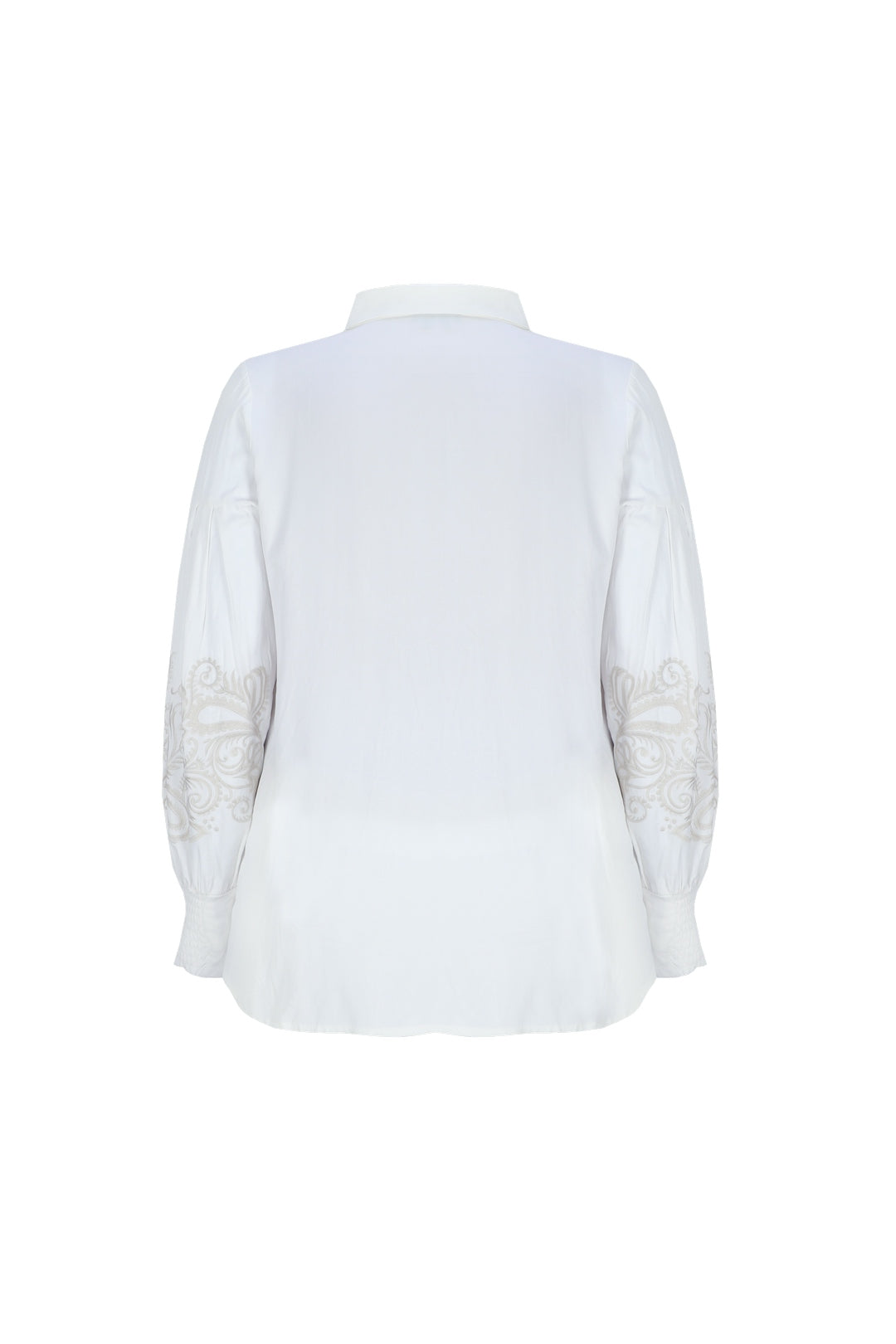 De Exxcellent damesoverhemd in roomwit heeft een klassieke overhemdkraag. De lange mouwen van dit item zijn voorzien van een sierlijk paisley borduursel op de onderarm, uitgevoerd in een lichte taupe kleur. De voorzijde van de blouse sluit met een doorlopende rij knopen. De manchetten zijn afgewerkt met een enkele knoop.
