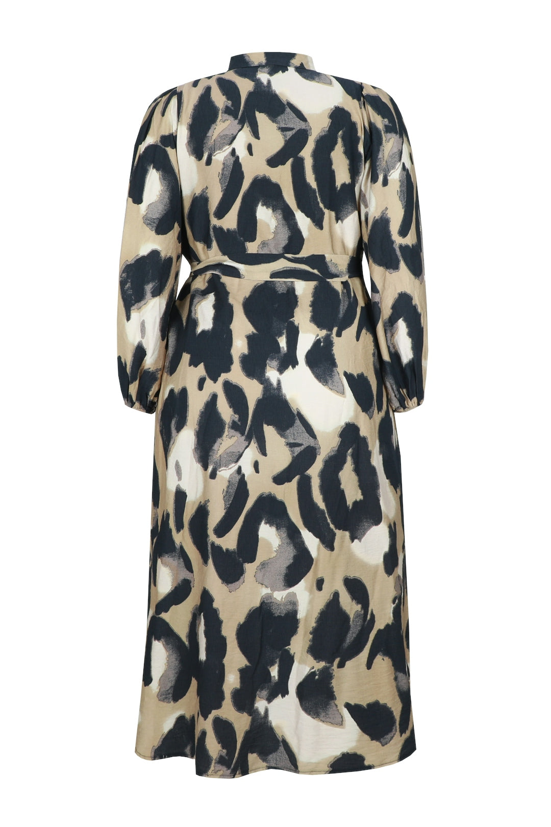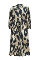 Deze lange overhemdjurk van Exxcellent, met een abstracte all-over print, is casual en modern. De maxi-jurk in beige, zwart en crème tinten heeft een klassieke kraag en een doorlopende knoopsluiting aan de voorzijde. De lange mouwen zijn licht gepoft bij de schouder en afgewerkt met een elastische manchet. De bijpassende stoffen ceintuur in de taille biedt je de mogelijkheid om de pasvorm naar wens aan te passen.