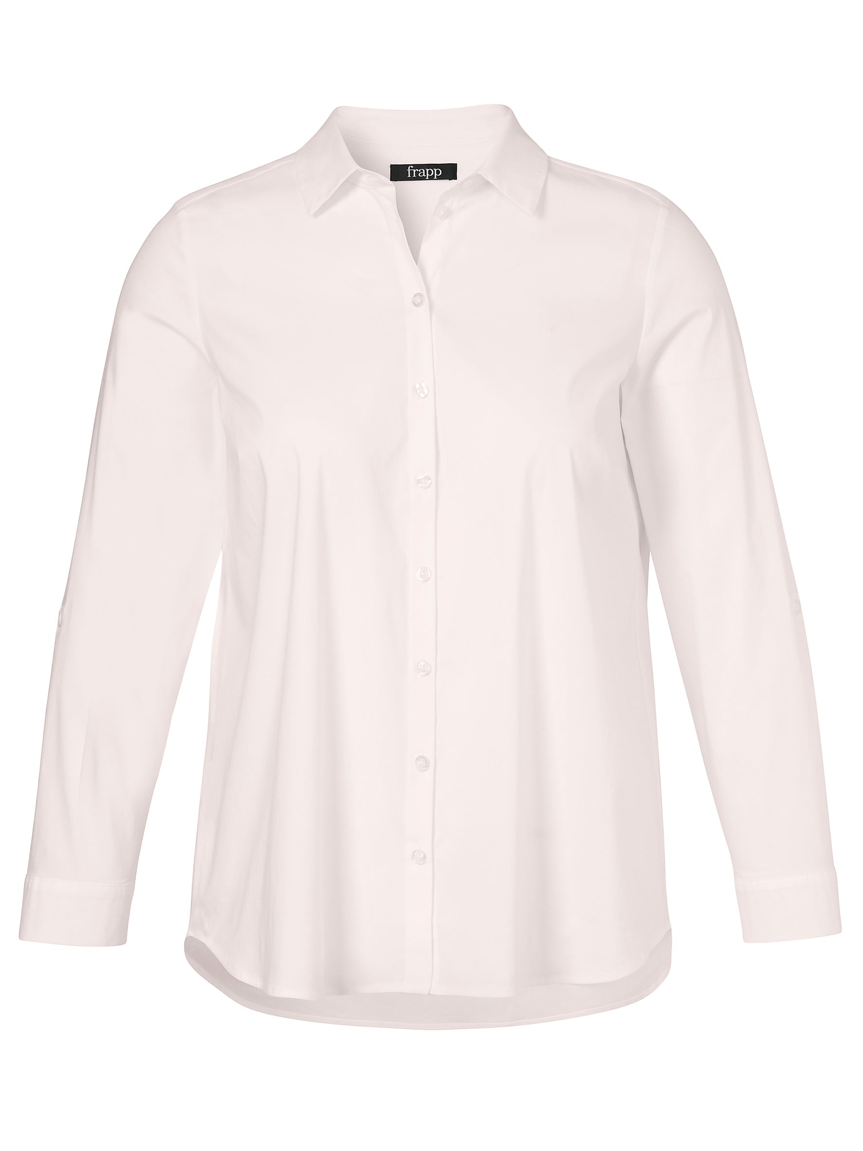 Deze witte damesblouse van Frapp, met de codering 2661670 rose, is een effen overhemd met een klassieke kraag. De lange mouwen zijn voorzien van een manchet met knoop en hebben een band waarmee je de mouw kunt oprollen. Het dames overhemd sluit aan de voorzijde met een doorlopende rij knopen. De casual pasvorm zorgt ervoor dat dit kledingstuk je veel bewegingsvrijheid geeft.