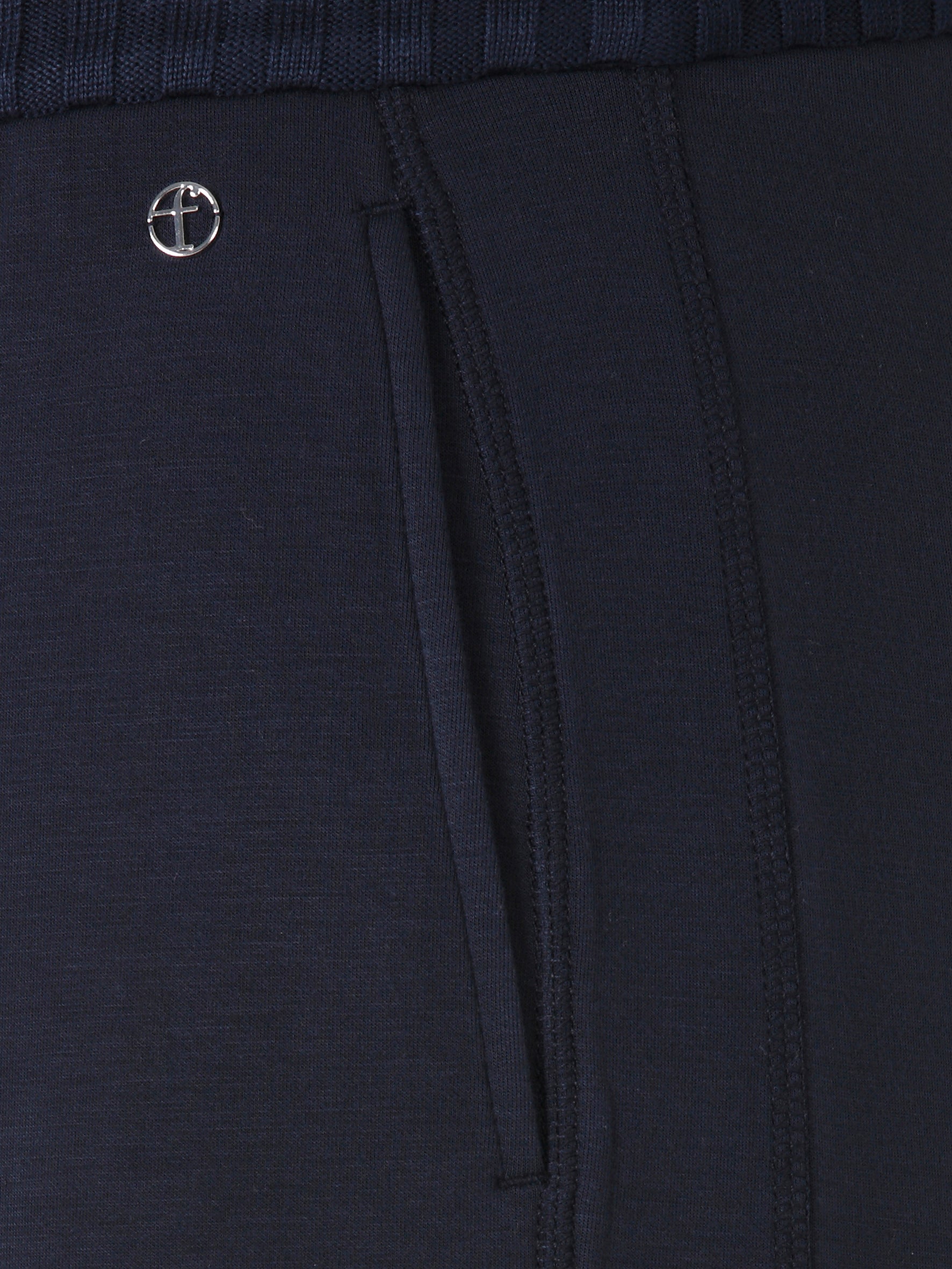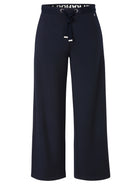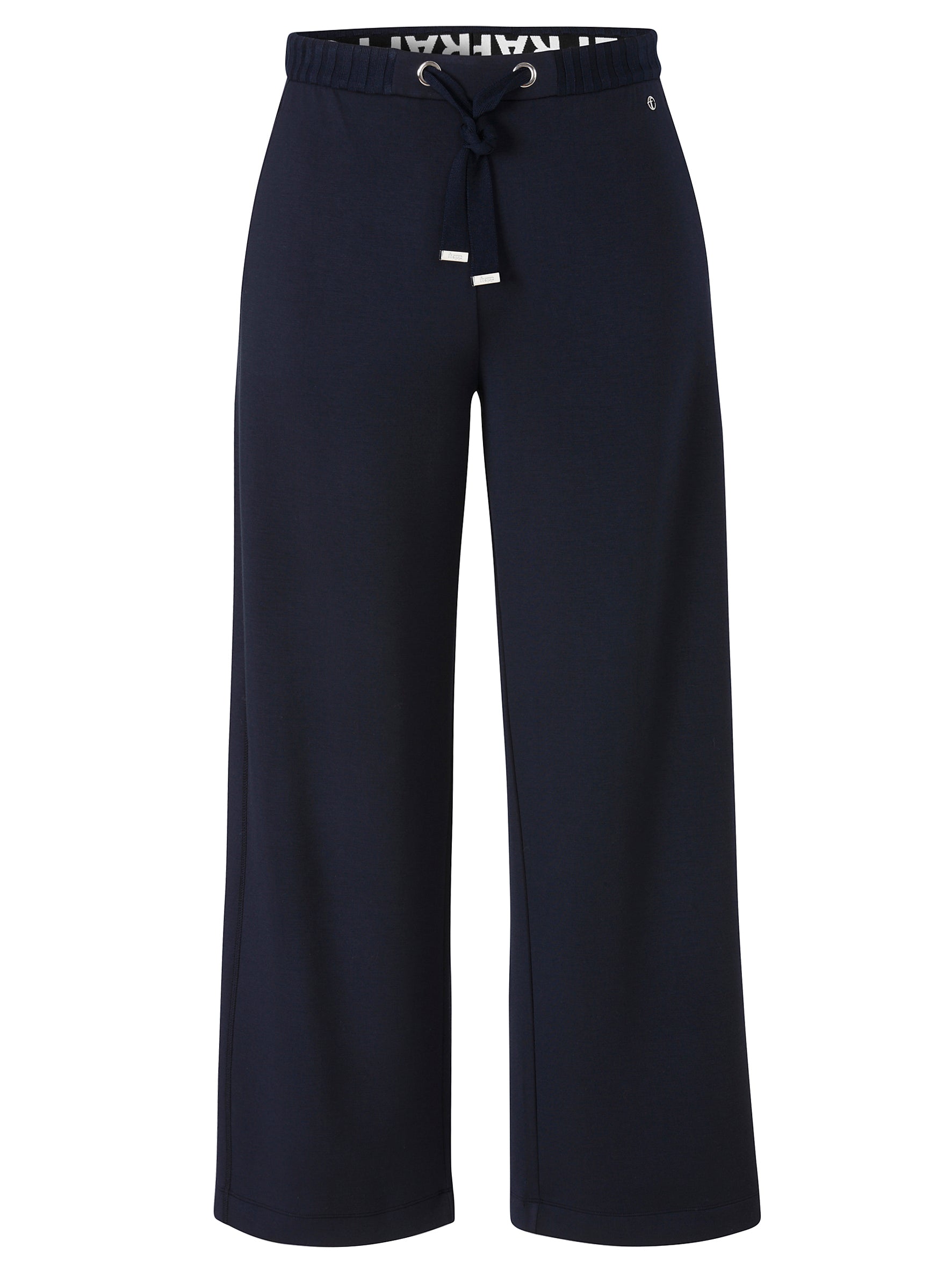 Deze navy wijdvallende broek van Frapp is uitgevoerd met een comfortabele elastische tailleband. De pantalon is voorzien van een functioneel trekkoord aan de voorzijde, afgewerkt met metalen uiteinden. Aan de zijkanten zijn steekzakken aangebracht en een klein metalen merkembleem is zichtbaar bij de heup. De binnenzijde van de tailleband toont een contrasterende print. Dit is een moderne broek die je casual draagt.