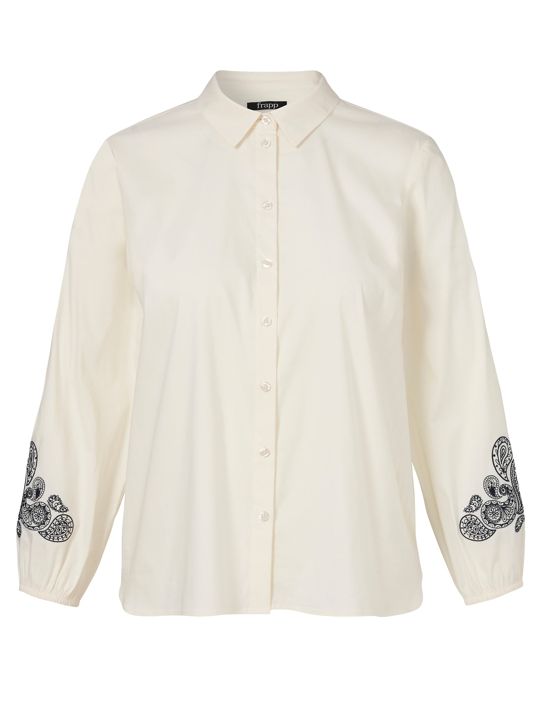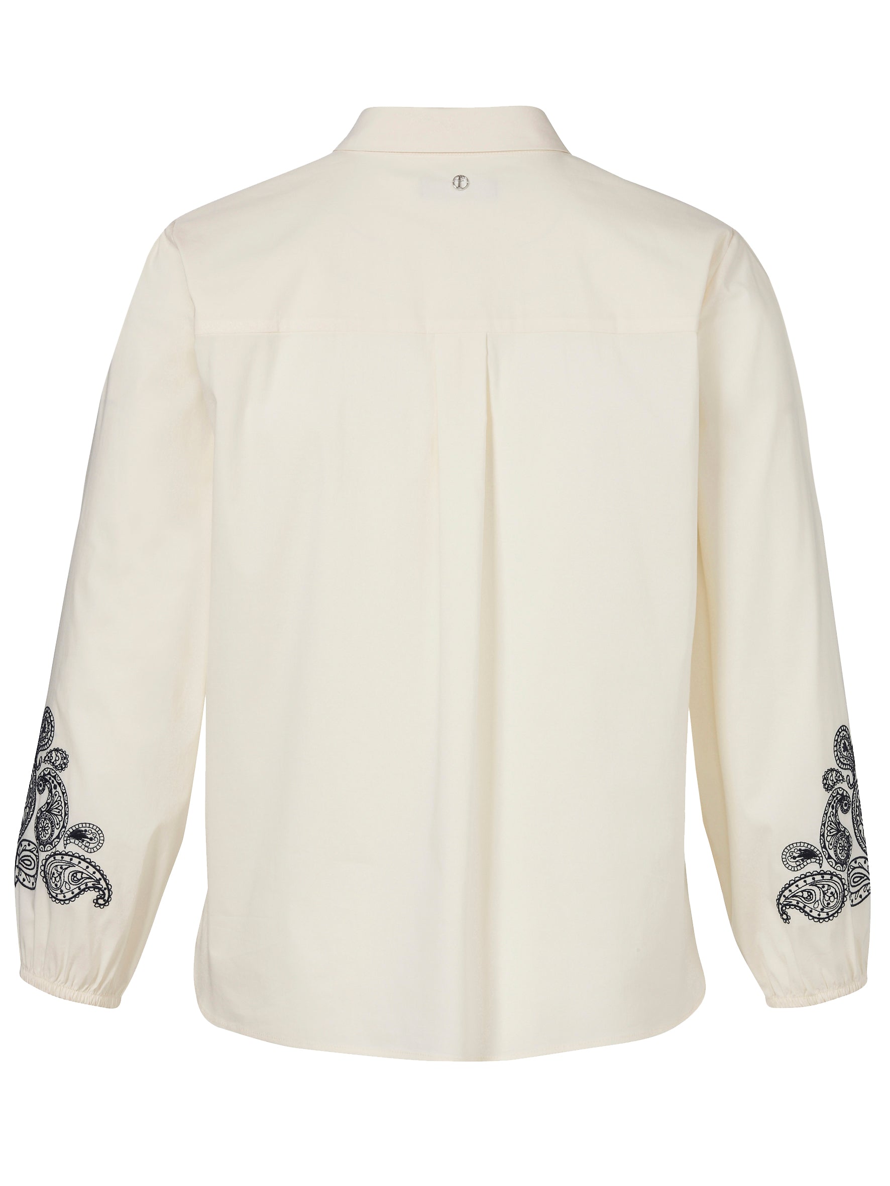 Deze casual damesblouse van Via Appia Due is uitgevoerd in een butterkleurige stof. Het kledingstuk heeft lange mouwen met geplooide manchetten die voorzien zijn van een opvallend navykleurig paisley borduursel. De blouse wordt gesloten door middel van een doorlopende knoopsluiting aan de voorzijde, voorzien van zeven knopen. Dit overhemd met klassieke kraag maakt dit een toegankelijk item dat je makkelijk combineert voor een optimistische en nuchtere uitstraling.