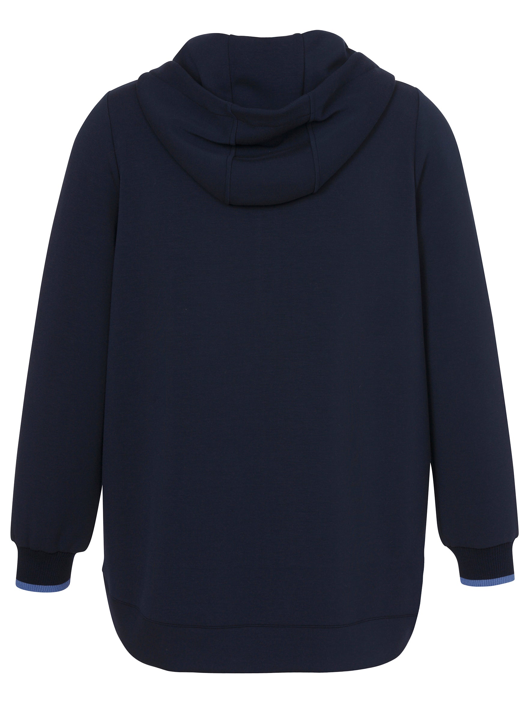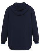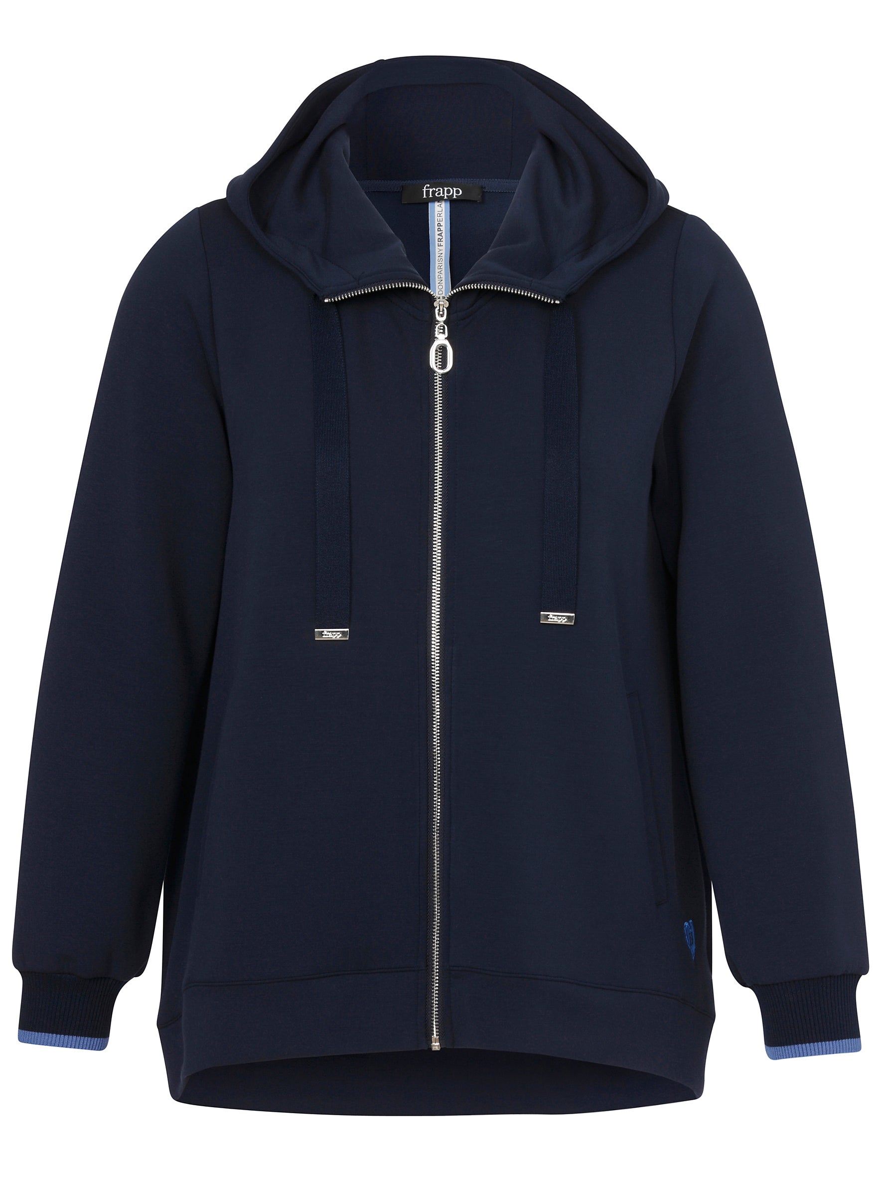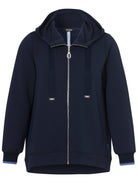 Dit donkerblauwe sweatvest van Via Appia Due is een casual jack dat comfort biedt voor alledaagse momenten. Het vest heeft een vaste capuchon met trekkoorden. Dit dames sweatvest sluit door middel van een zilverkleurige ritssluiting over de gehele lengte. Aan de voorzijde zijn twee steekzakken aangebracht. De mouwuiteinden zijn voorzien van ribgebreide boorden met een lichtblauwe bies.
