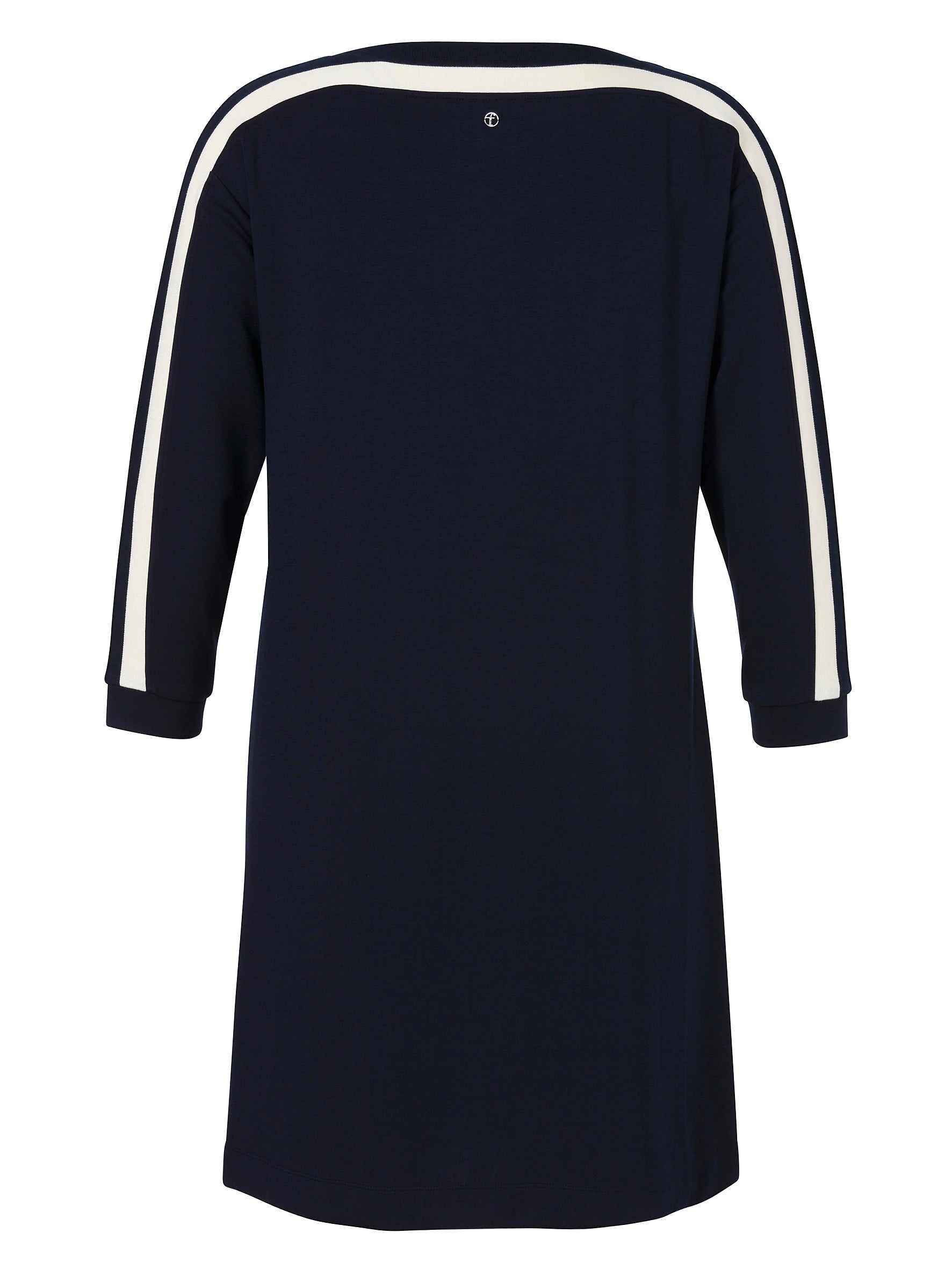 Deze jurk van Via Appia Due combineert navy met butterkleurige accenten. Het casual kledingstuk heeft driekwart mouwen met sportieve strepen in contrasterende kleur langs de schouders. De halslijn is breed en rond. Een subtiel logo is geplaatst op de achterzijde van de nek. Deze korte damesjurk reikt tot boven de knie en voelt soepel aan.