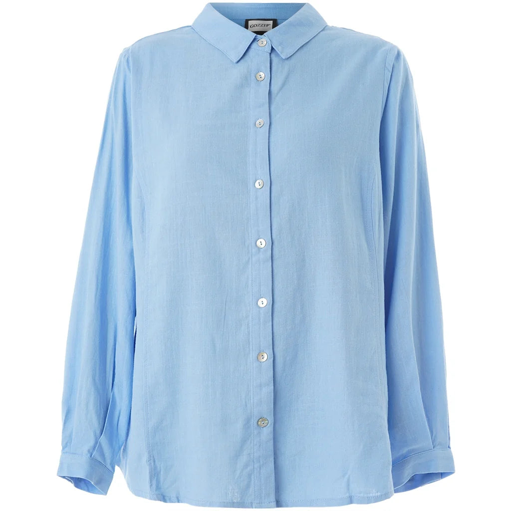 De Gozzip Blouse G261018 Lichtblauw is een casual overhemd met een effen dessin. Dit model van het merk Gozzip heeft lange mouwen en een klassieke kraag. De blouse is voorzien van een doorlopende knoopsluiting aan de voorzijde met zeven zichtbare knopen. De lange mouwen eindigen in een manchet met een enkele knoopsluiting. Deze lichtblauwe blouse is ontworpen voor een ruime, comfortabele pasvorm die je makkelijk combineert.Pasvorm en Stijladvies