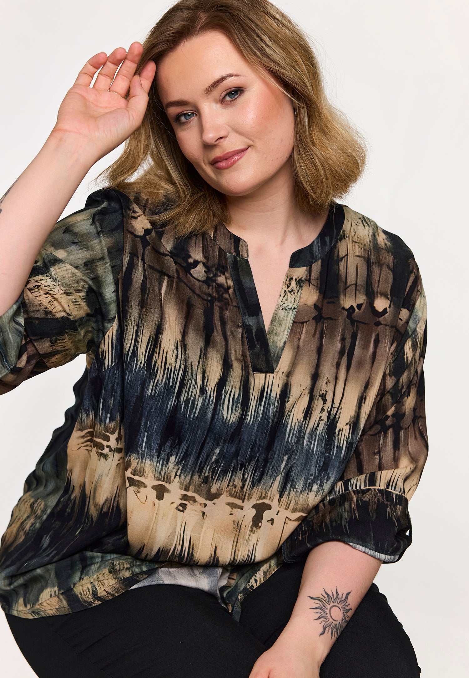 Door het all-over dessin combineer je deze Gozzip tuniekblouse het beste met neutrale, effen items. Je draagt de blouse makkelijk op een wijde, beige broek of een donkere jeans voor een casual uitstraling. Voor meer inspiratie bekijk je de gehele collectie van Gozzip.Productkenmerken