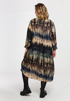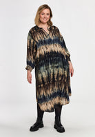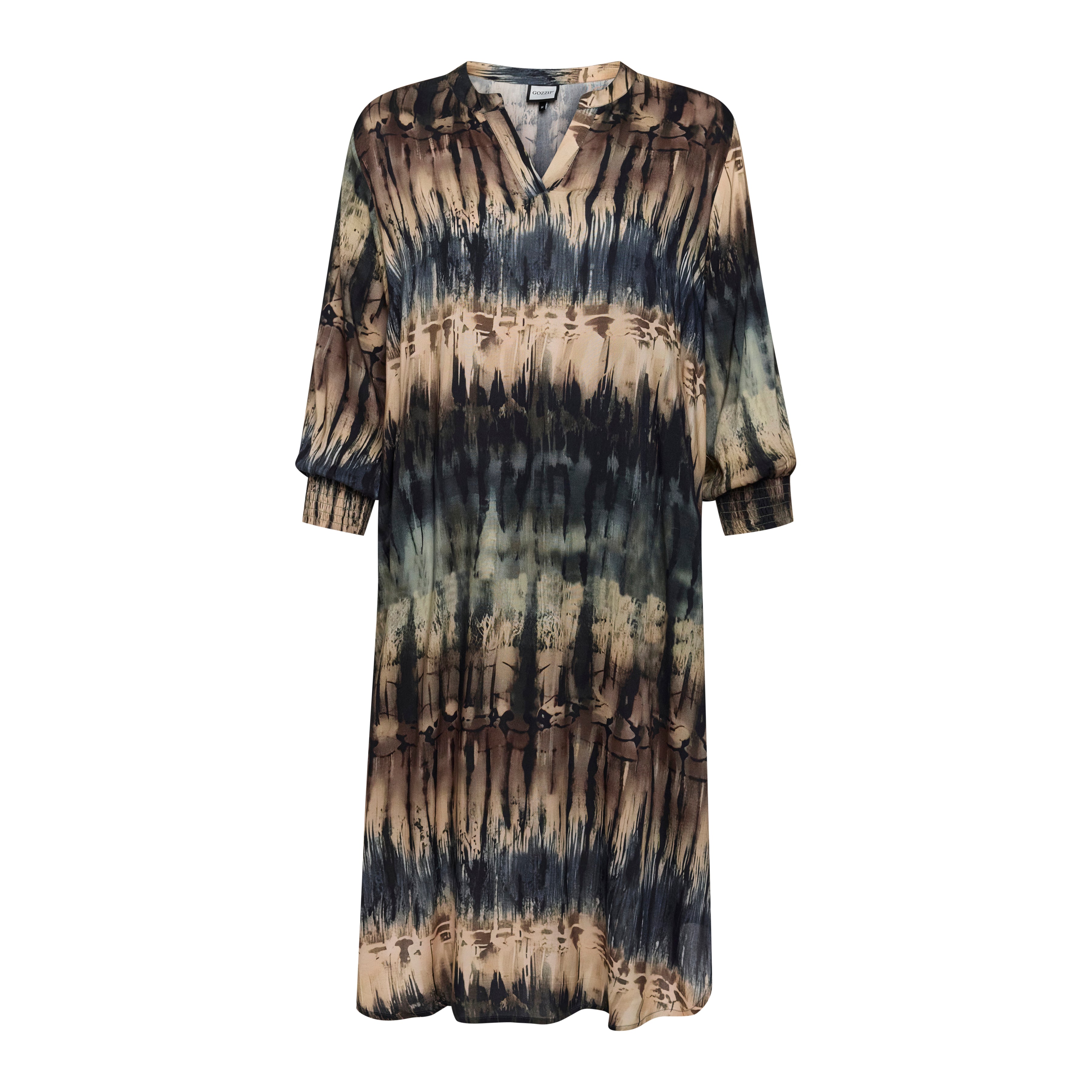 Deze lange Gozzip jurk (model G261038) heeft een V-hals en een korte opstaande kraag. De damesjurk is voorzien van een all-over gestreept dessin in multi-color, met zichtbare tinten donkerblauw, bruin en beige. De ruime pasvorm en de lange mouwen met smock-manchetten aan de uiteinden zorgen voor een nonchalante look. Deze moderne tuniekjurk is ontworpen om losjes te vallen.Pasvorm en Stijladvies