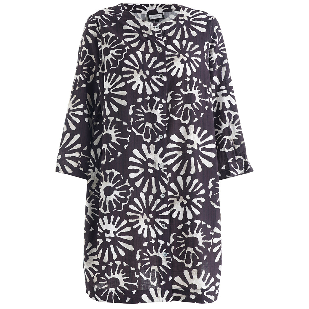 De Gozzip Tuniek G261028 in zwart/wit is een korte tunica met een grafische all-over print. Dit kledingstuk voor grote maten van het merk Gozzip heeft driekwartsmouwen en een doorlopende knoopsluiting aan de voorzijde. De tuniek valt tot boven de knie.Pasvorm en Stijladvies