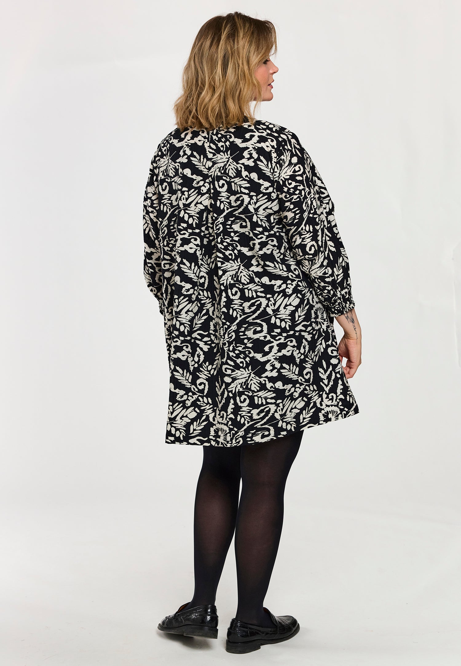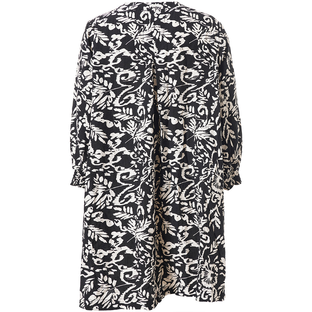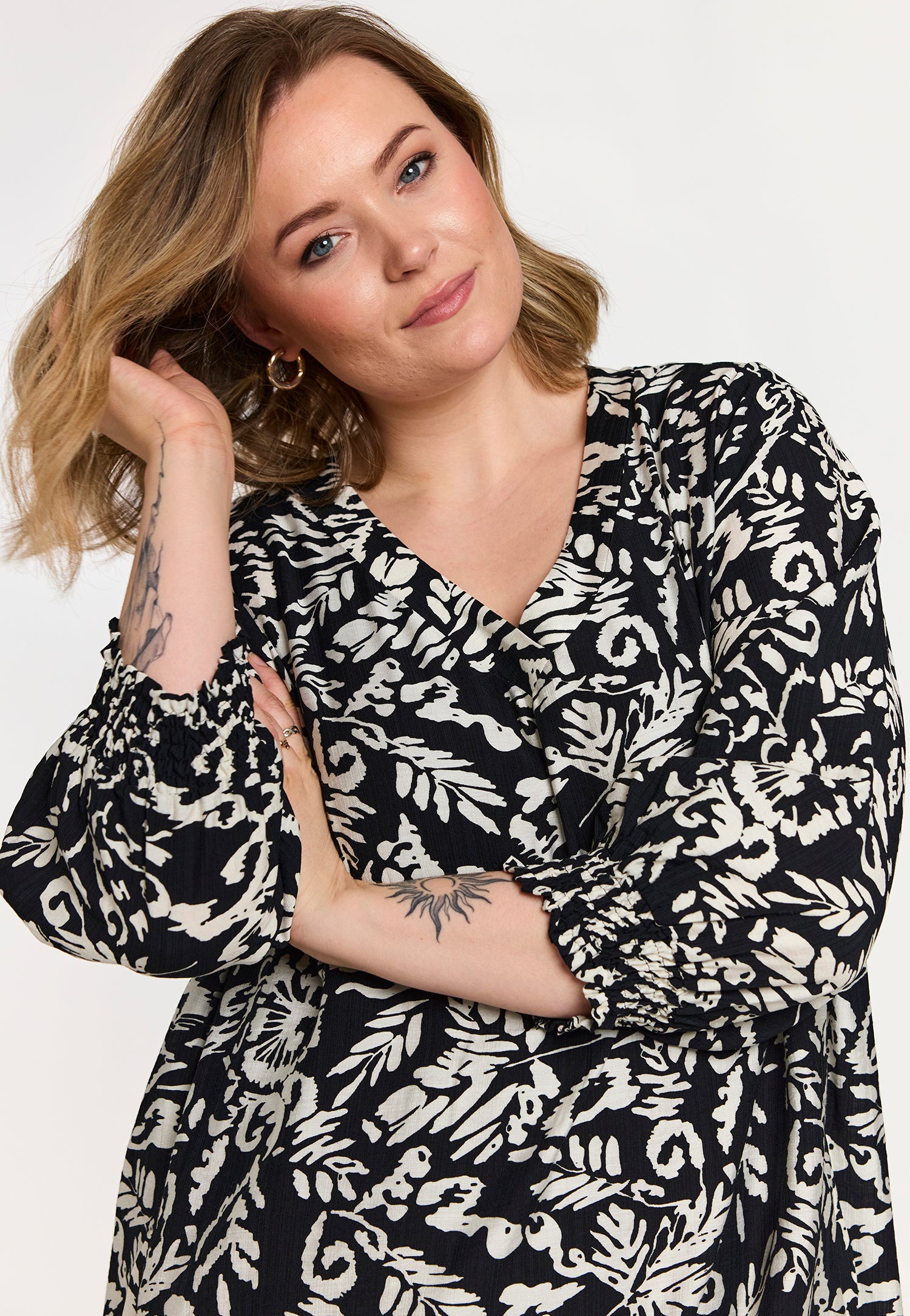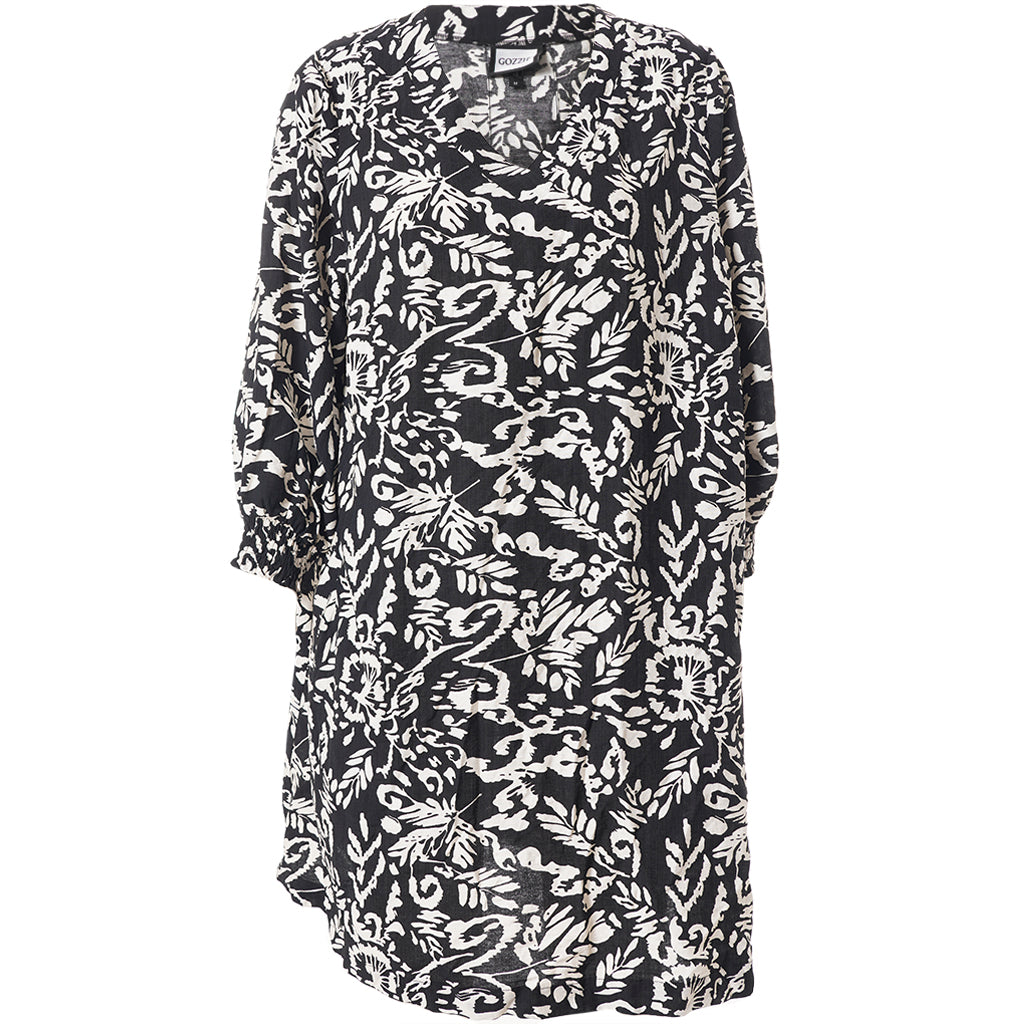 De Gozzip Tuniek G261031 Zwart/Wit is uitgevoerd in een all-over bladprint. Deze tuniekjurk heeft een comfortabele V-hals en driekwart mouwen die eindigen in een gesmokte boord. Het casual ontwerp zorgt voor een relaxte uitstraling die je makkelijk de hele dag draagt. Dit is een veelzijdige kledingstijl van het merk Gozzip voor een optimistische en open look.Pasvorm en Stijladvies