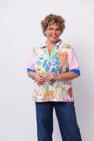 De Herzens Blouse 25261-6070 Multi is een casual damesshirt met korte mouwen. Dit kledingstuk heeft een opvallend dessin met diverse jungle elementen, zoals flamingo’s en bloemmotieven, op een witte basis. De klassieke overhemdkraag en V-hals opening zorgen voor een toegankelijke uitstraling. De kraag en mouwboorden zijn afgewerkt met contrasterende strepen en patronen. Dit is een veelzijdige top die je makkelijk combineert voor een optimistische, casual look.Pasvorm en Stijladvies