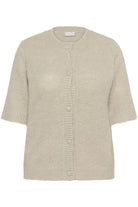 Dit korte vest, ontworpen door Kaffe curve en onderdeel van DK Company, is uitgevoerd in de neutrale kleur Feather Gray Melange. Het gebreide vest heeft een fijne steek en een klassieke ronde halslijn. De sluiting aan de voorzijde bestaat uit een verticale rij van zes knopen. Dit casual model is voorzien van mouwen tot op de elleboog en eindigt met een rechte, geribbelde zoom. Je hebt hiermee een toegankelijk kledingstuk dat makkelijk te integreren is in jouw dagelijkse garderobe.