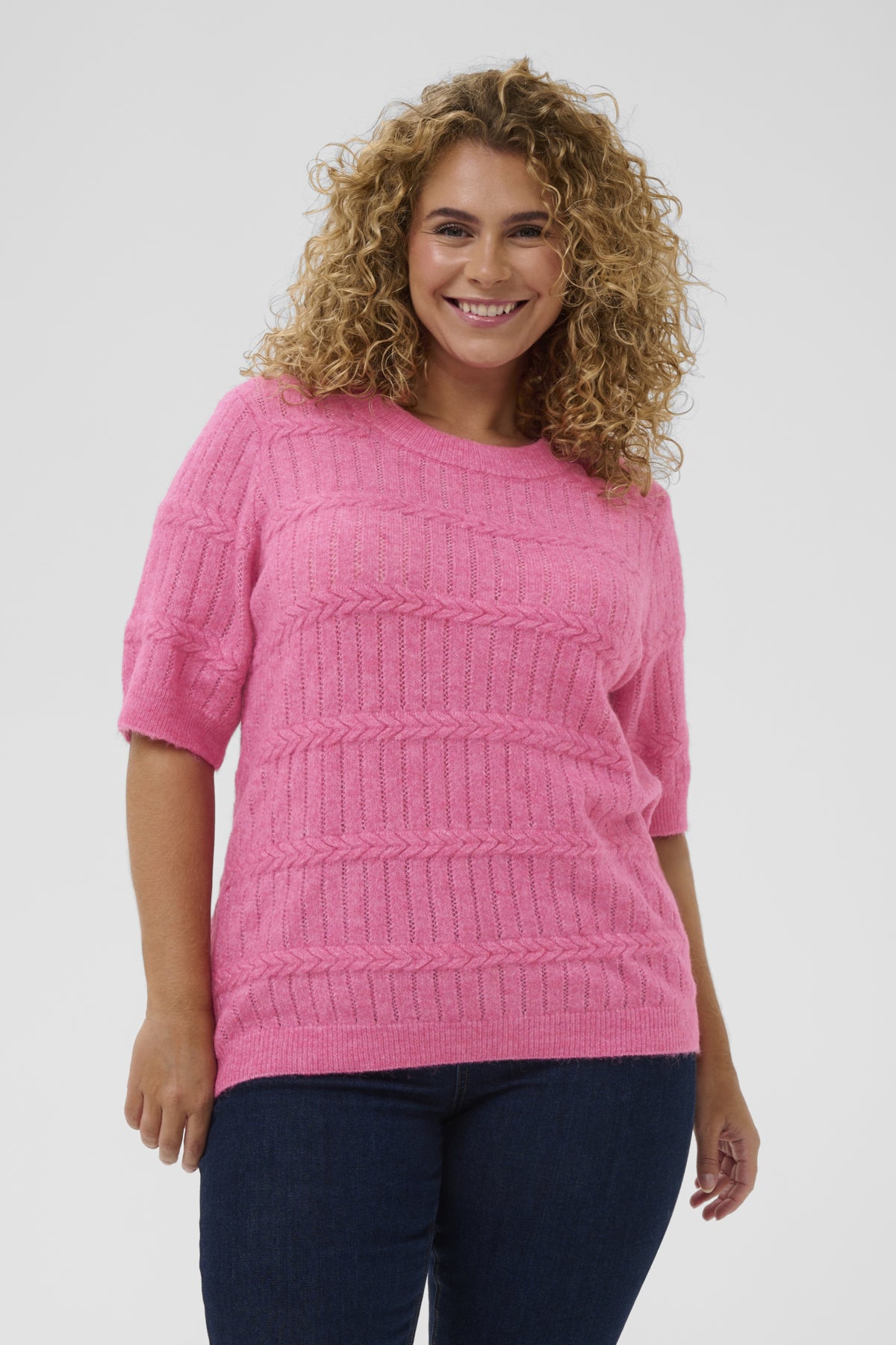 Deze korte mouwen trui van het merk Kaffe curve, onderdeel van DK Company, heeft de Pink Power Melange kleurstelling. Het gebreide bovenstuk is voorzien van een structuur die bestaat uit afwisselende horizontale ribbels en verticale vlechten. De pullover is afgewerkt met een ronde halslijn en ingezette korte mouwen. Dit gebreide kledingstuk is ontworpen om een casual en moderne toevoeging te zijn aan je dagelijkse kledingkeuze.
