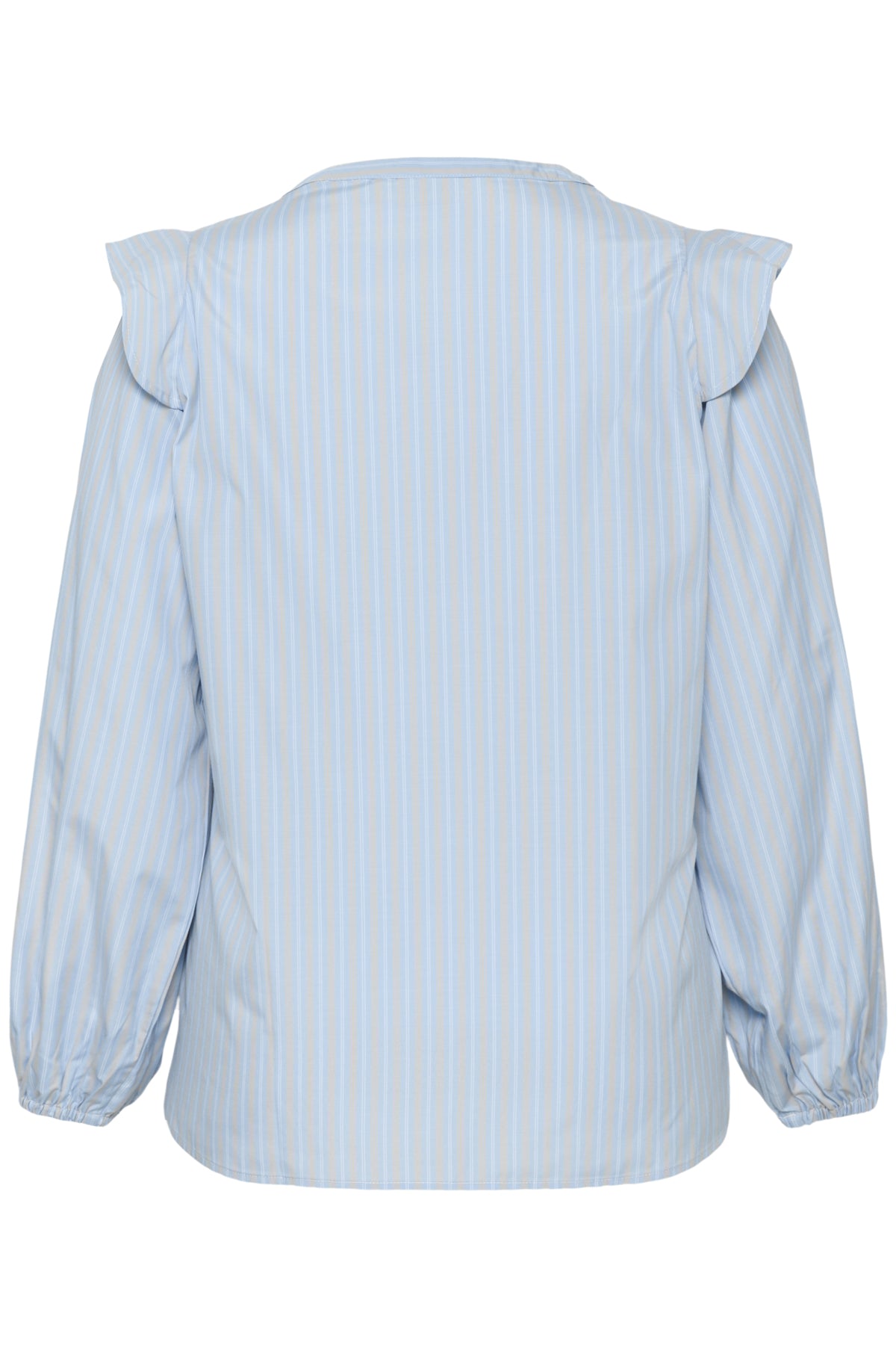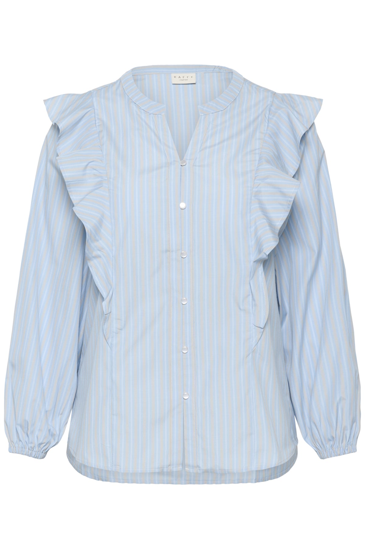 Deze gestreepte blouse van Kaffe curve, uitgevoerd in de kleur Powder Blue Stripe, heeft lange mouwen en een opstaande kraag. Het bovenstuk is voorzien van een V-hals uitsnijding met een zichtbare knoopsluiting aan de voorzijde. Opvallend zijn de volants die verticaal langs de sluiting lopen en doorgaan over de schouders. De lange mouwen eindigen in een elastische manchet. Deze blouse in grote maat van Kaffe curve biedt een toegankelijke, casual uitstraling.