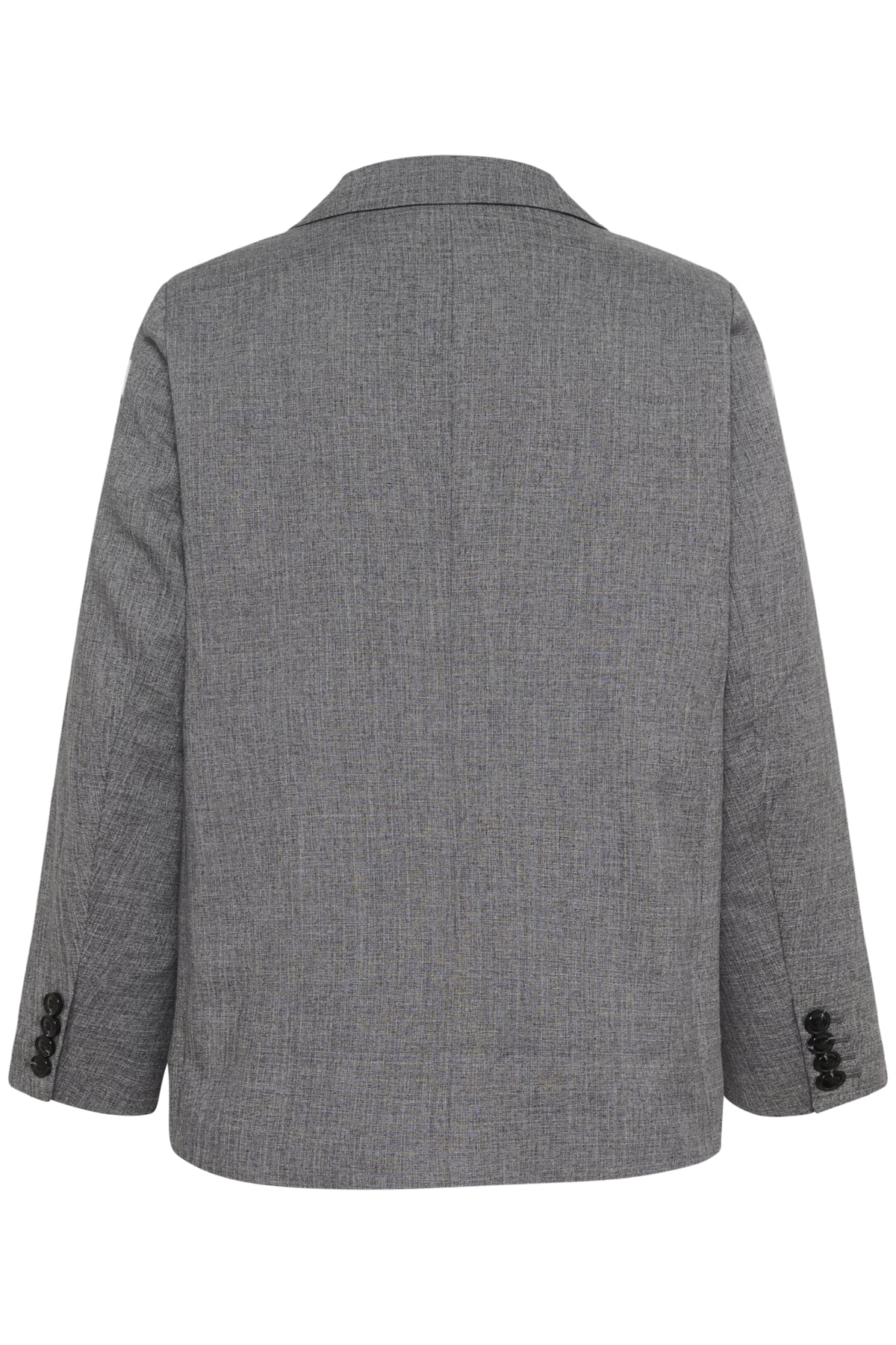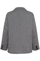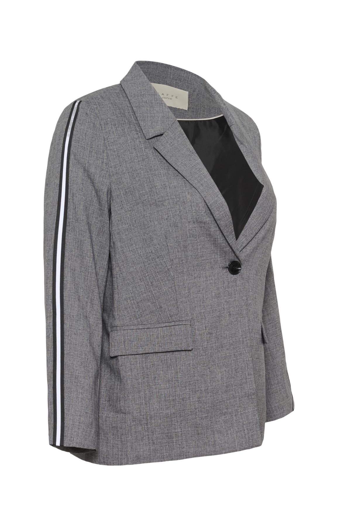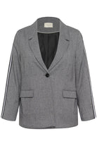 Dit moderne dames colbert, de Kaffe curve Blazer 10583903 in Grijze Melange, heeft een klassieke reverskraag. De blazer sluit met één knoop en is voorzien van twee opgestikte klepzakken aan de voorzijde. Een opvallend kenmerk van dit jasje zijn de contrasterende zijstrepen in zwart en wit langs de mouwen.
