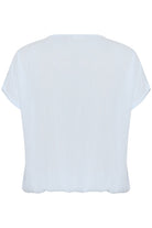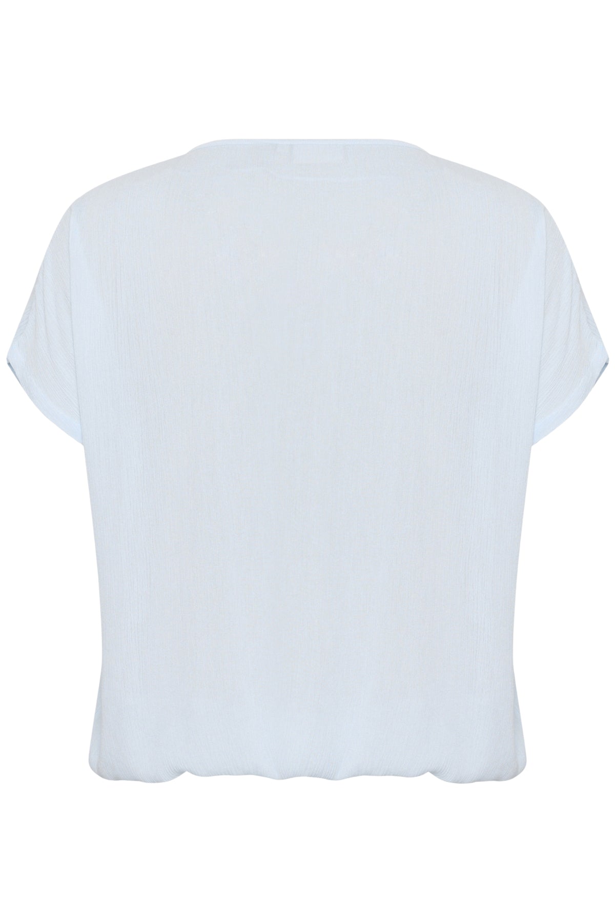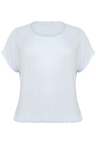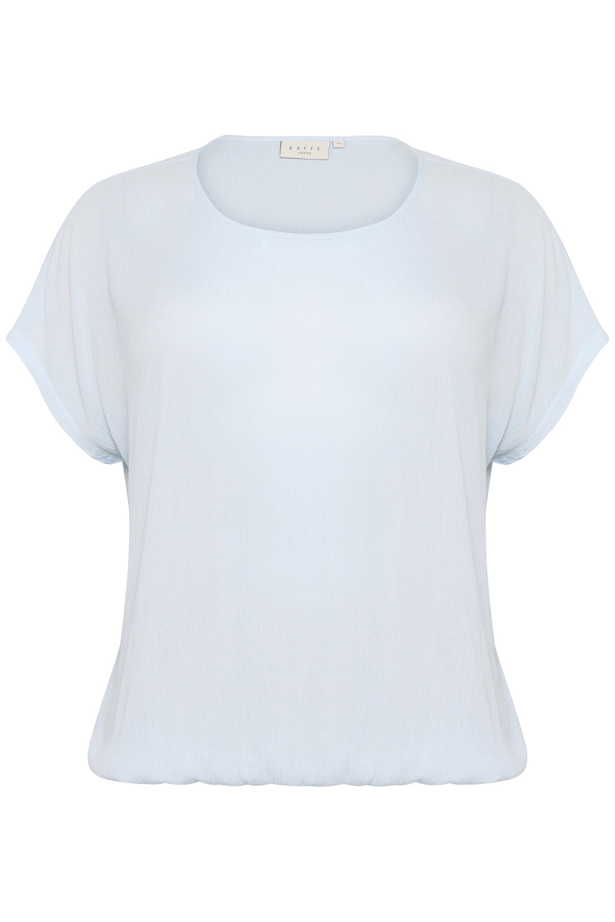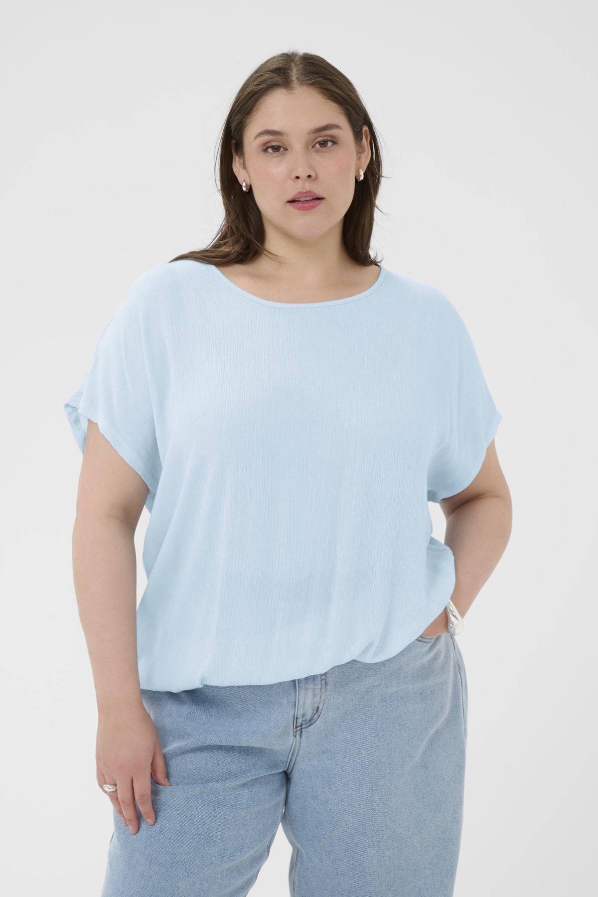 Deze lichtblauwe top van Kaffe Curve heeft een ronde hals en korte mouwen. Het kledingstuk is vervaardigd uit een geweven stof met een subtiele structuur. Aan de onderzijde is een elastieken boord aangebracht die zorgt voor een licht bloezend effect. Je draagt dit item comfortabel door de soepele valling van de stof.