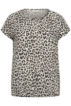 Deze blouse van het merk Kaffe curve is uitgevoerd in een all-over dierenprint met bruine en zwarte tinten. Het kledingstuk heeft korte mouwen en een ronde halslijn. Aan de onderzijde bevindt zich een elastische zoom die zorgt voor een licht poffend effect op de heup. De soepele stof valt losjes langs het lichaam en geeft je outfit een eigentijdse uitstraling.