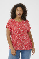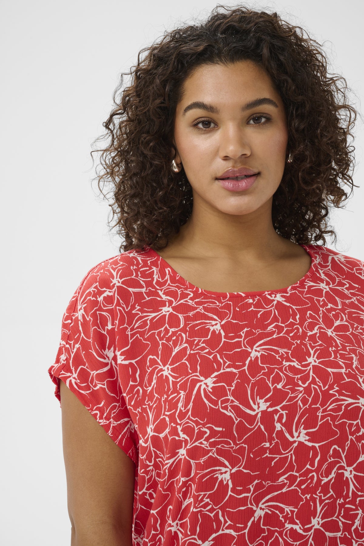 De Kaffe curve Blouse 10580836 in Poppy Red heeft een all over Chalk Flower bloemenprint in wit. Deze casual top is uitgevoerd met een ronde hals en korte, omgeslagen mouwen. Het shirt van Kaffe curve is speciaal ontworpen voor de curve maten. De stof van deze damesblouse valt soepel en voelt licht aan, wat zorgt voor een relaxte uitstraling tijdens warme dagen.Pasvorm en Stijladvies