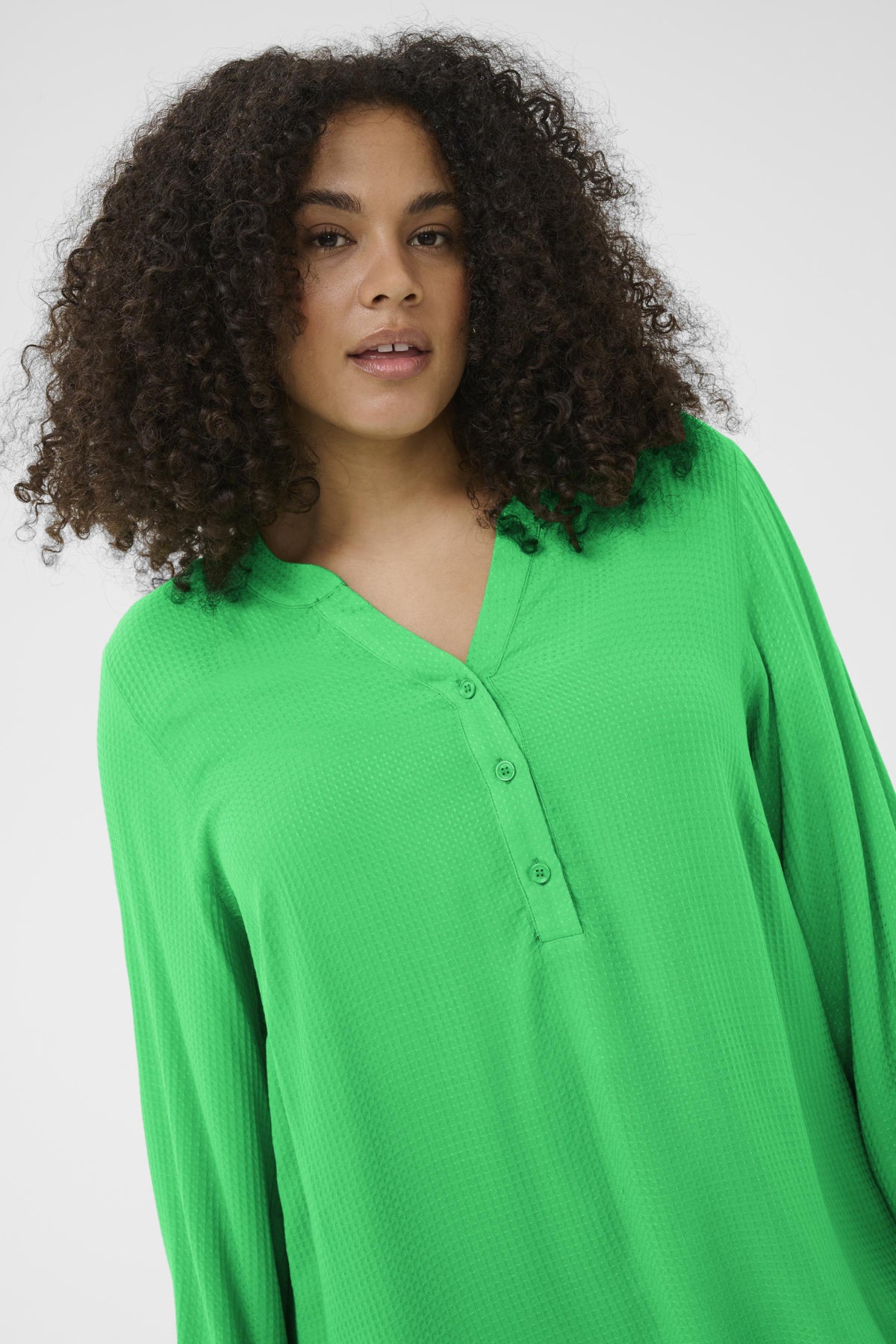 Deze Bright Green blouse van Kaffe curve 10582911 heeft een losse pasvorm en wafelstructuur. Dit casual shirt is voorzien van een V-hals met een korte knoopsluiting. De lange mouwen hebben een elastische manchet. Deze langere blouse valt soepel en is een comfortabele keuze voor jouw dagelijkse look, waardoor je een optimistische uitstraling creëert.