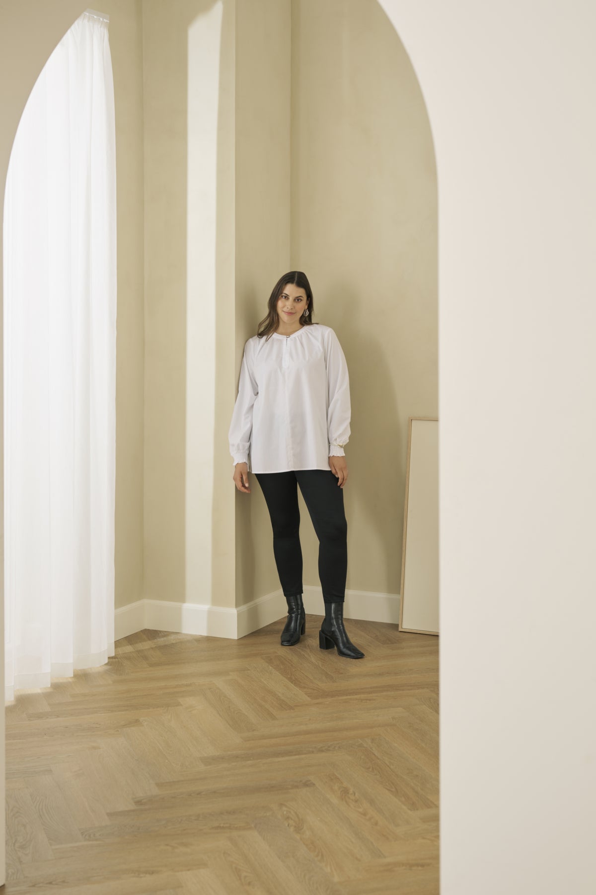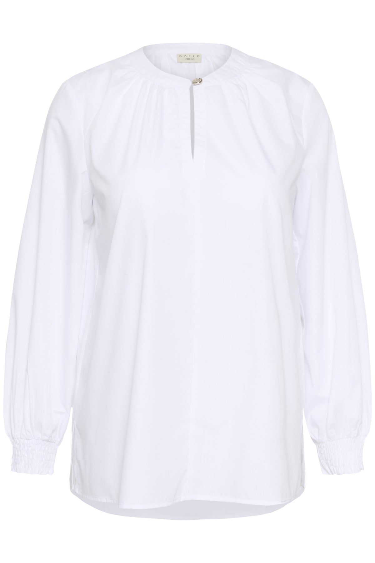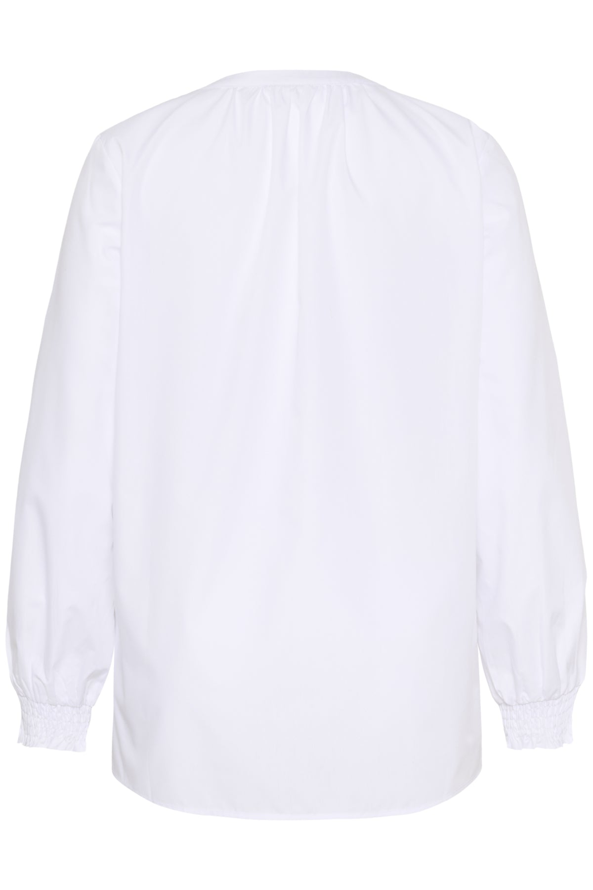 Deze Kaffe curve blouse is uitgevoerd in de kleur Optical White. De lange mouwen hebben een gesmokte afwerking bij de pols, wat zorgt voor volume. De witte bovenkleding heeft een hoge, kraagloze halslijn met fijne plooien aan de voorzijde. In het midden van de hals zit een korte V-split, voorzien van een enkele metalen sluiting. Dit moderne dames item van Kaffe curve heeft een losvallende pasvorm, ideaal voor een casual en toegankelijke look.